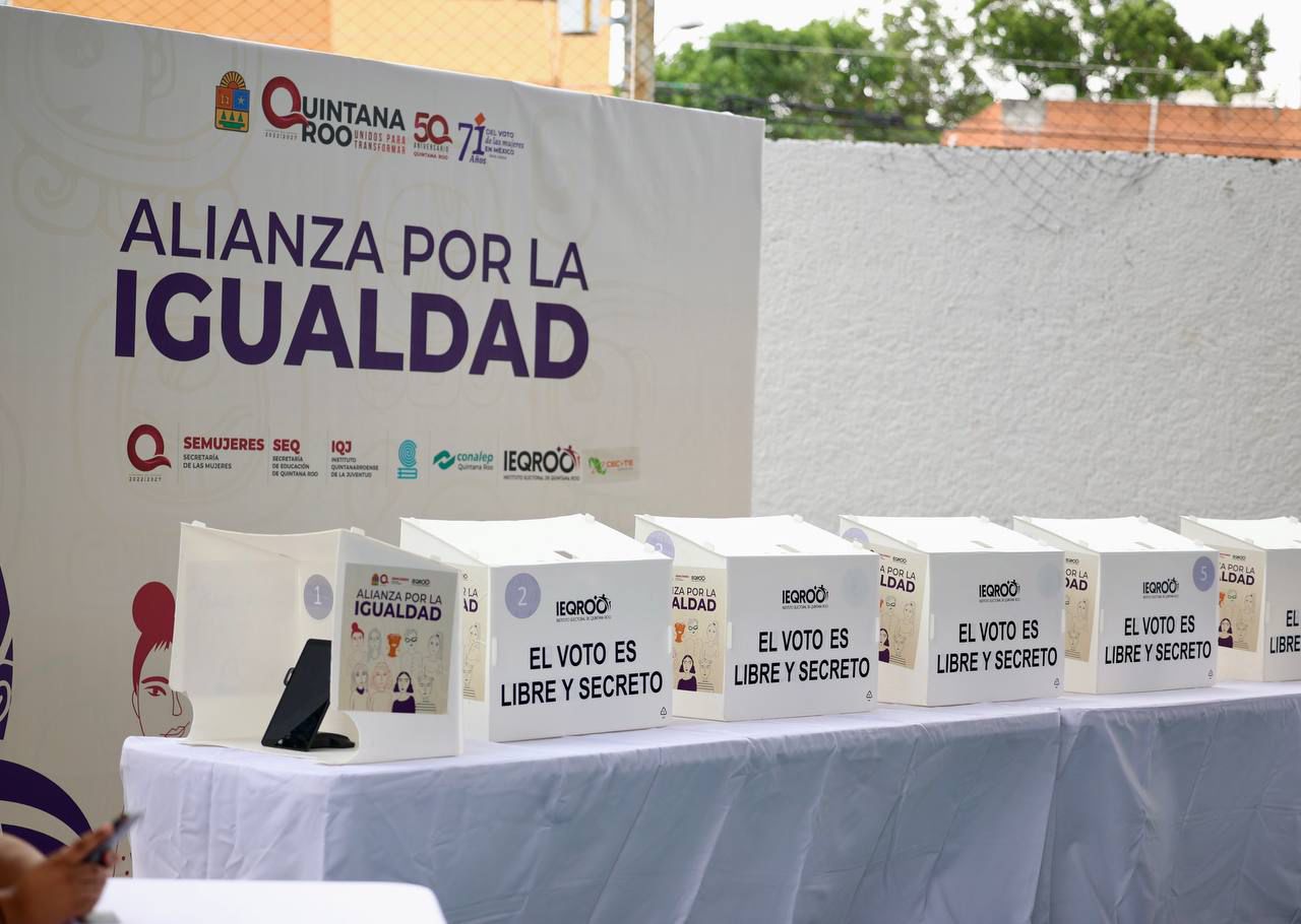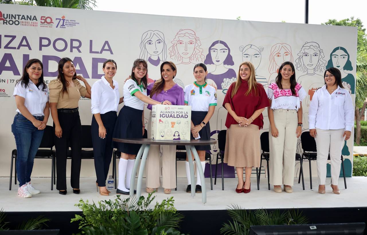 Cancún, Q. R., a 17 de octubre de 2024.- En el marco del 71 Aniversario del Voto de la Mujer en México, y con el objetivo de fomentar la cultura cívica y democrática, así como impulsar la participación política de las mujeres desde la adolescencia, la Presidenta Municipal, Ana Paty Peralta, atestiguó la inauguración del ejercicio “Alianza por la Igualdad, Nuestra Opinión Cuenta”, encabezado por la gobernadora Mara Lezama, donde 400 jóvenes mujeres integrantes del CECYTE II votaron para elegir a seis embajadoras que conformarán este proyecto.