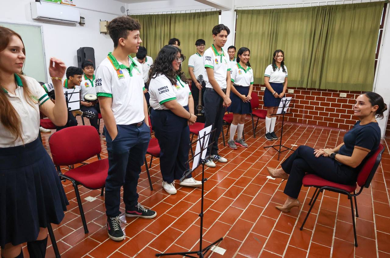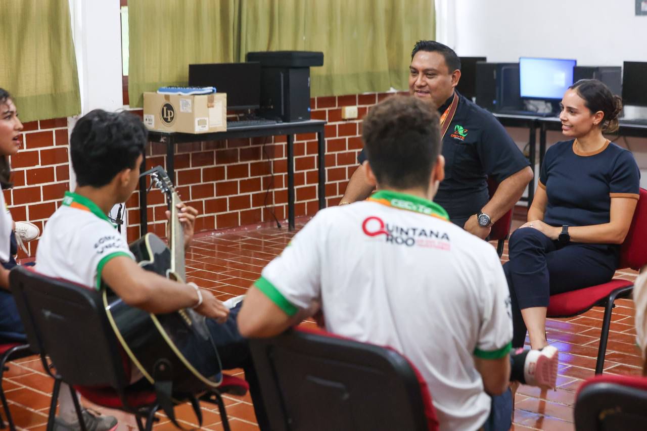 En el marco del Día Internacional del Músico, celebrado cada 22 de noviembre, la Alcaldesa visitó el plantel CECyTE Cancún II, donde constató el avance de los alumnos desde que, hace un año, donó instrumentos musicales al Club de Música de la institución, para fomentar el talento y la pasión artística entre los estudiantes.