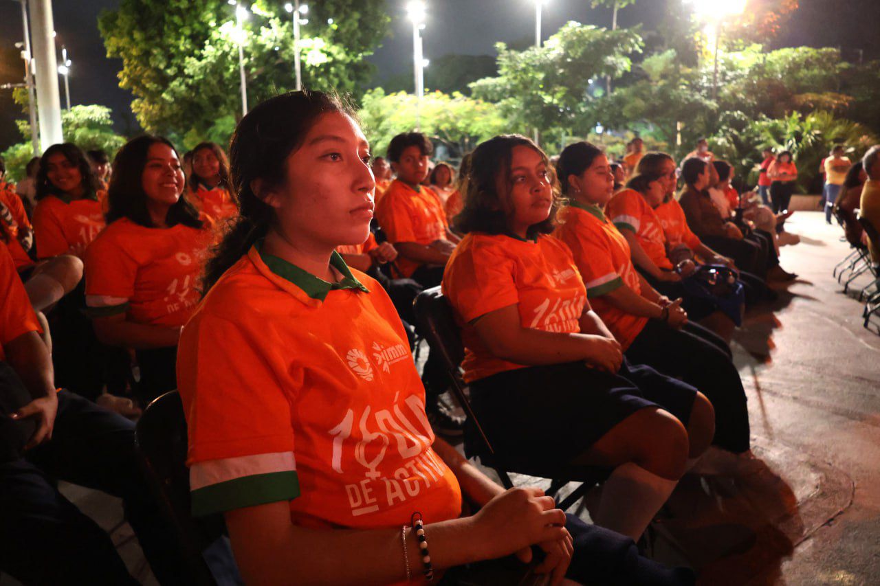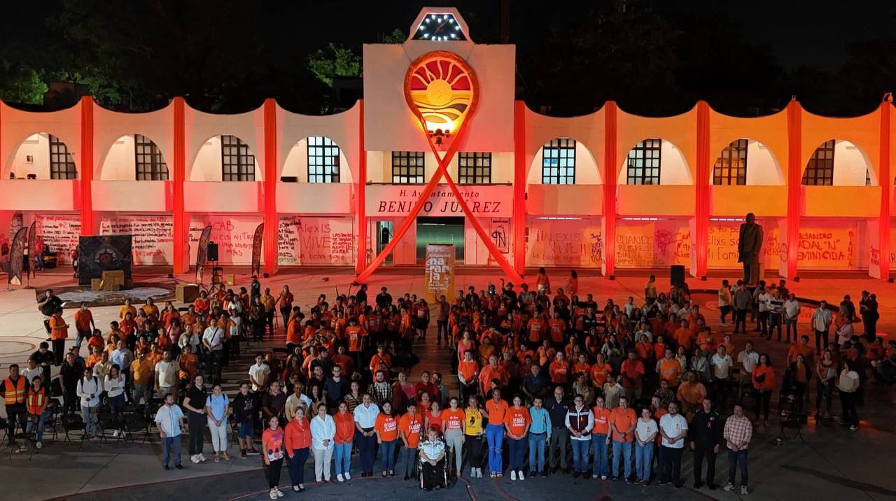 “Este encendido naranja es una promesa, un símbolo de esperanza y un compromiso, la promesa de que sí se puede vivir sin violencia, la esperanza de una sociedad más justa y respetuosa y el compromiso de ser agentes de cambio para construir el mundo que soñamos”, enfatizó frente estudiantes, jóvenes de servicio social del Instituto Municipal de la Juventud (IMJUVE), así como mujeres beneficiarias de diversos programas del IMM.
