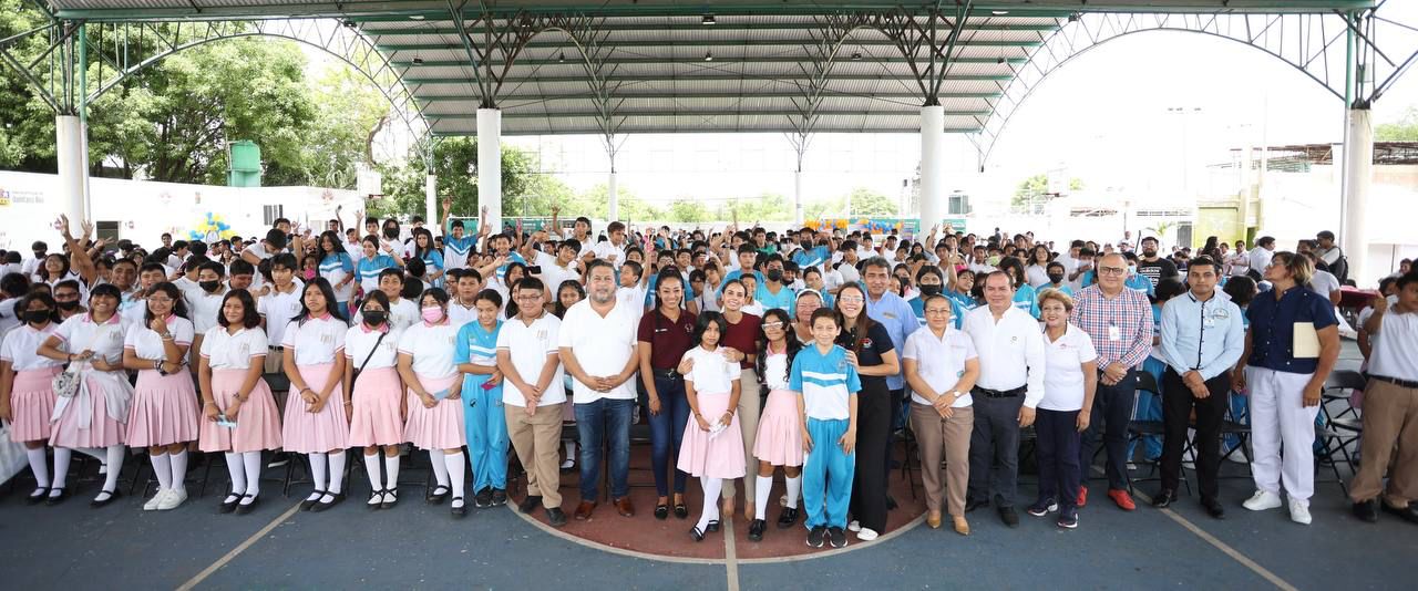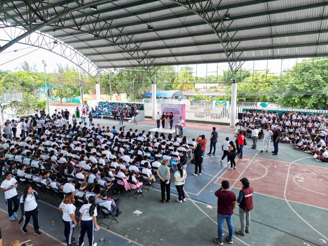 Cancún, Q. R., a 22 de junio de 2023.- Alrededor de 500 alumnos de secundarias y preparatorias en Cancún acudieron a la primer Jornada de Salud Integral para las Juventudes, realizada en el domo deportivo “Jacinto Canek”, en la cual tuvieron la oportunidad de saludar también a la Presidenta Municipal, Ana Paty Peralta, además de aprovechar diferentes módulos de asesoría y servicios médicos de varias instancias.