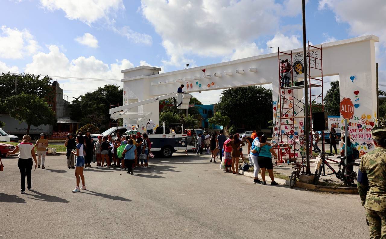 Cancún, Q. R., a 10 de diciembre de 2024.- Con la participación de decenas de niñas, niños, jóvenes y adultos, el Gobierno de Benito Juárez se sumó a la iniciativa del Gobierno de Quintana Roo, la Fábrica de Artes y Oficios (FARO) y la ONUDC de pintar los arcos de Villas Otoch Paraíso, que se desarrolló además con diversas actividades culturales para crear comunidad entre los vecinos de la zona.