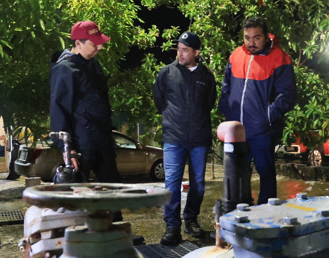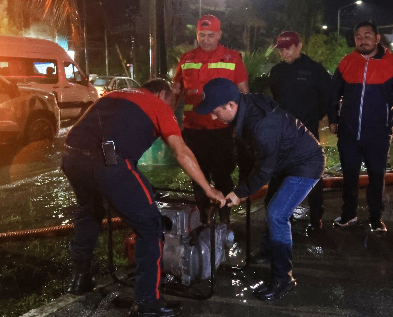 Durante esta acción, el Secretario General, junto a los titulares de Protección Civil y del Heroico Cuerpo de Bomberos, Aquileo Cervantes Álvarez, supervisó el desagüe con bombas de achique en la avenida Sunyaxchén, Bonampak y la colonia Donceles.