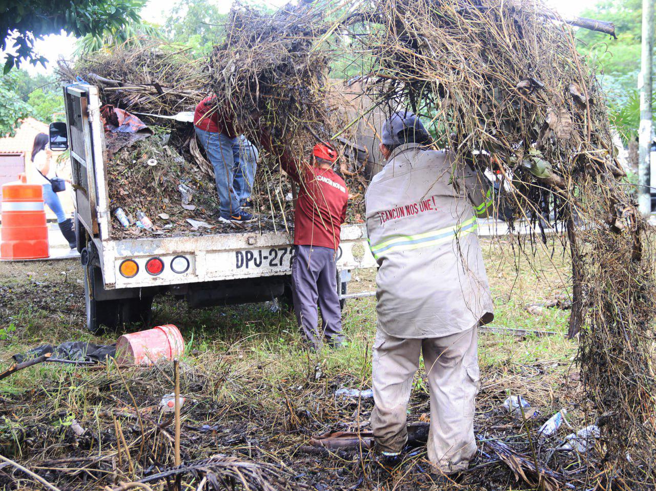 Posteriormente, las autoridades se trasladaron a la Av. Nichupté, a la altura del Fracc. Villas Cancún, en donde se llevó a cabo el chapeo, poda de un área verde, retiro de un árbol caído y recoja de basura vegetal, despejando la zona.