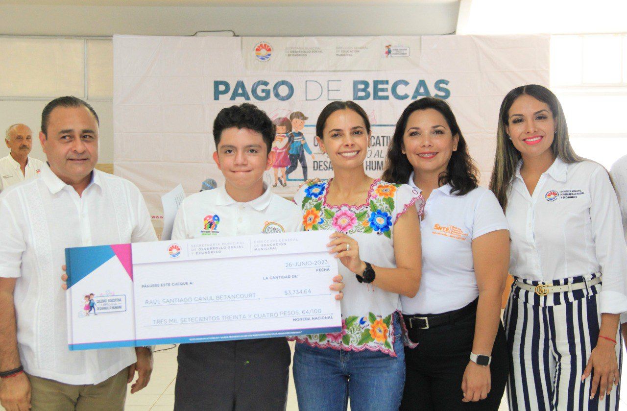Cancún, Q. R., a 26 de junio de 2023.- “Para mí era muy importante venir hoy aquí a hacer la entrega de algunos de los pagos de becas, porque es fundamental para nosotros el bienestar de las niñas, niños y jóvenes, porque con la educación podemos construir un mejor futuro”, dijo la Presidenta Municipal, Ana Paty Peralta, en la entrega de 600 de un total de tres mil 228 becas del Programa “Calidad Educativa e Impulso al Desarrollo Humano”, mismas que correspondieron al segundo pago del ciclo escolar 2022-2023 de los niveles especial, preescolar, medio superior y superior.