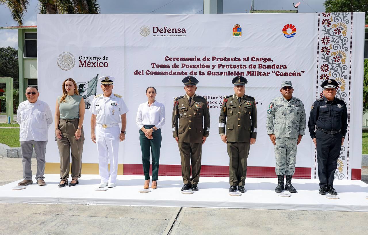 Cancún, Q. R., a 05 de febrero de 2025.- La Presidenta Municipal, Ana Patricia Peralta, atestiguó la protesta al cargo, así como toma de posesión y protesta de bandera al General Brigadier D. E. M., Claudio Edmundo Huizar de la Torre, como comandante de la Guarnición Militar de Cancún.