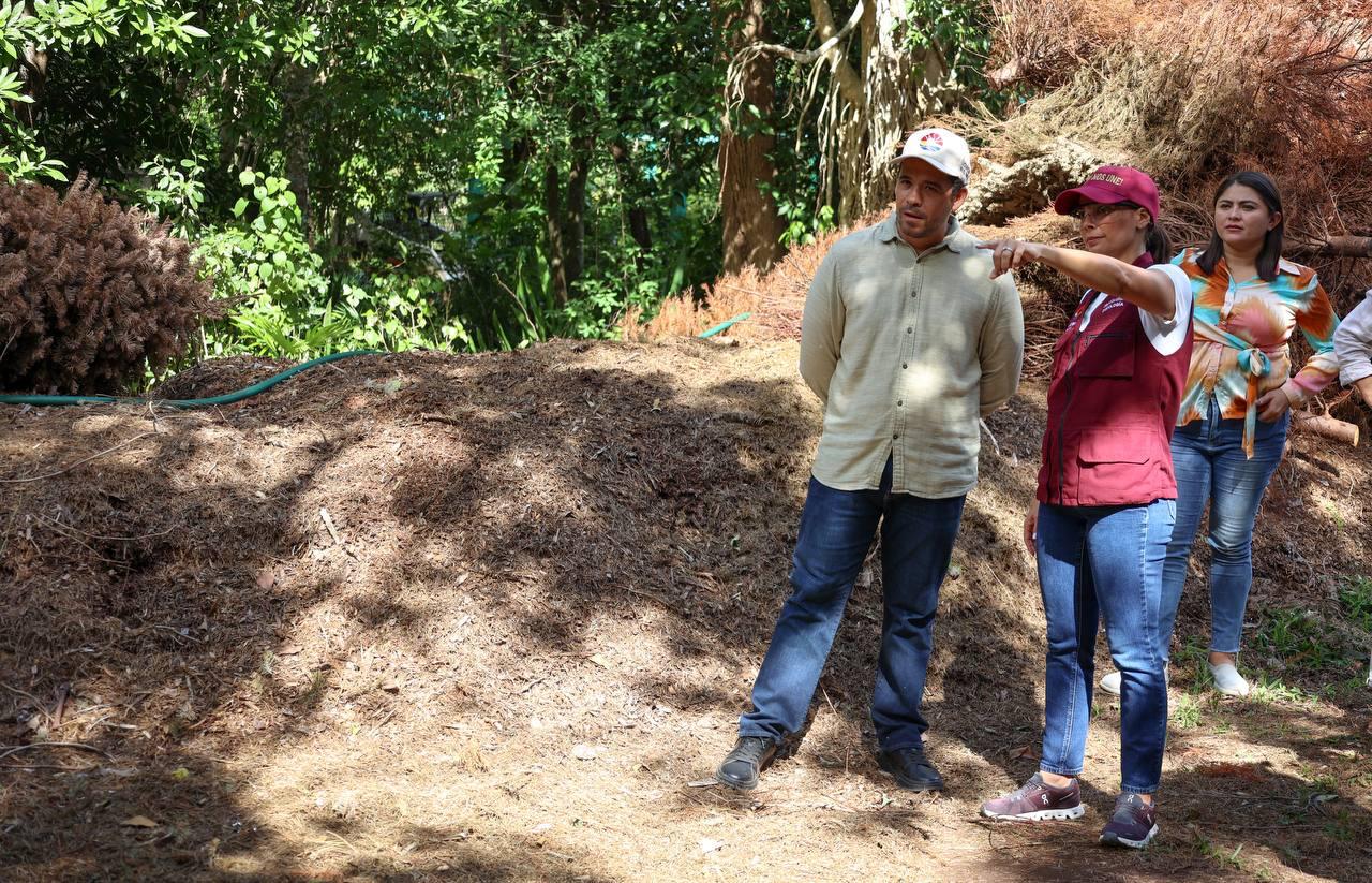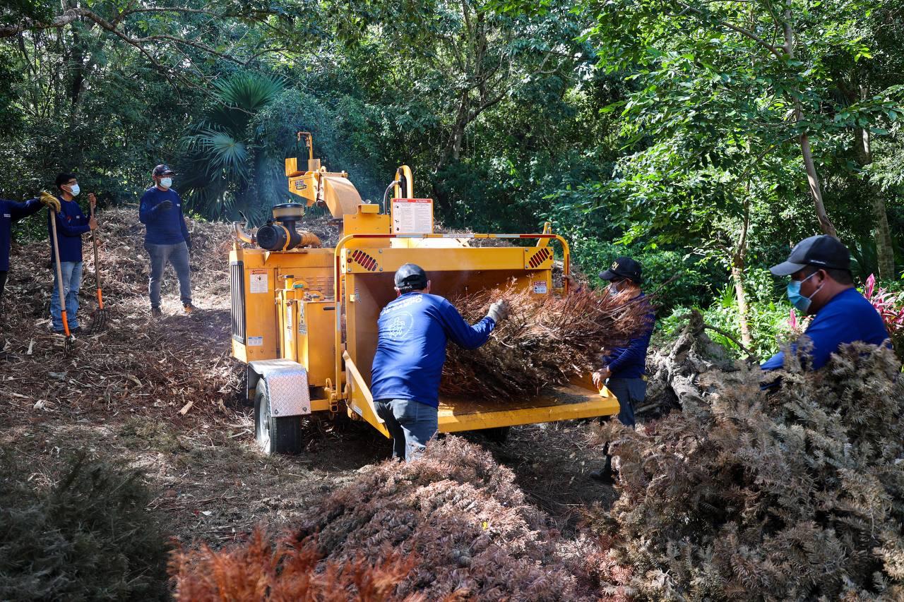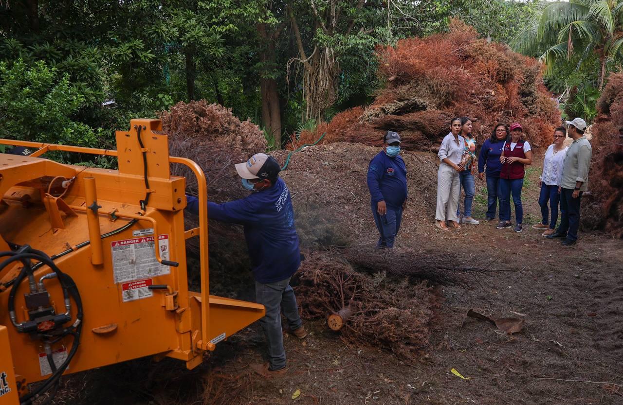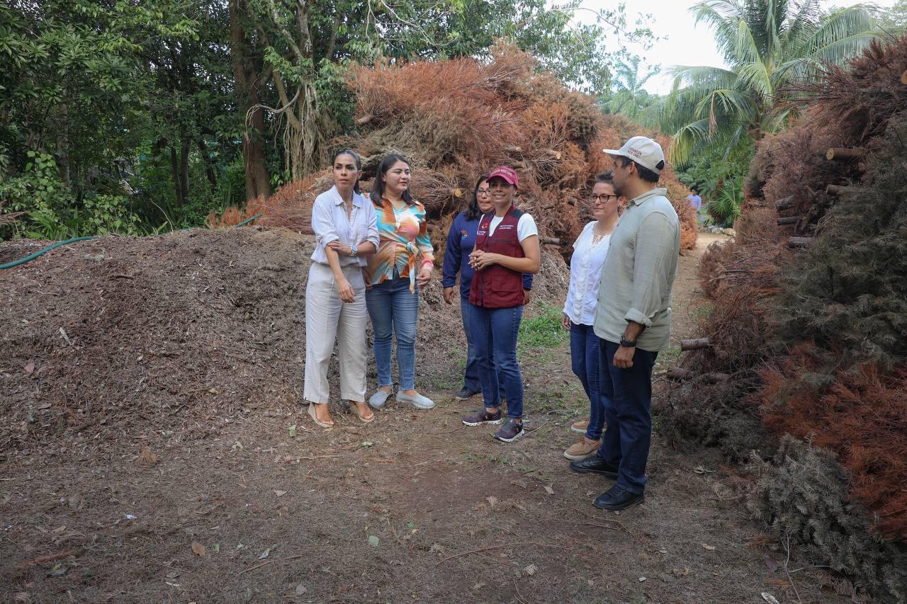 En las instalaciones del Vivero Municipal Kabah, la Alcaldesa, acompañada por la secretaria municipal de Ecología y Desarrollo Urbano, Nahielli Margarita Orozco Lozano y el director general de Ecología, Fernando Haro Salinas, verificó el proceso de cómo se trituran los árboles y su importancia de reutilizarse.
