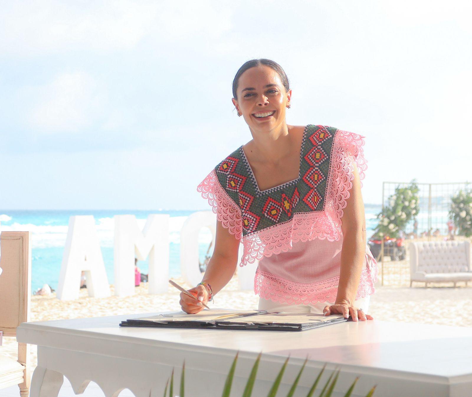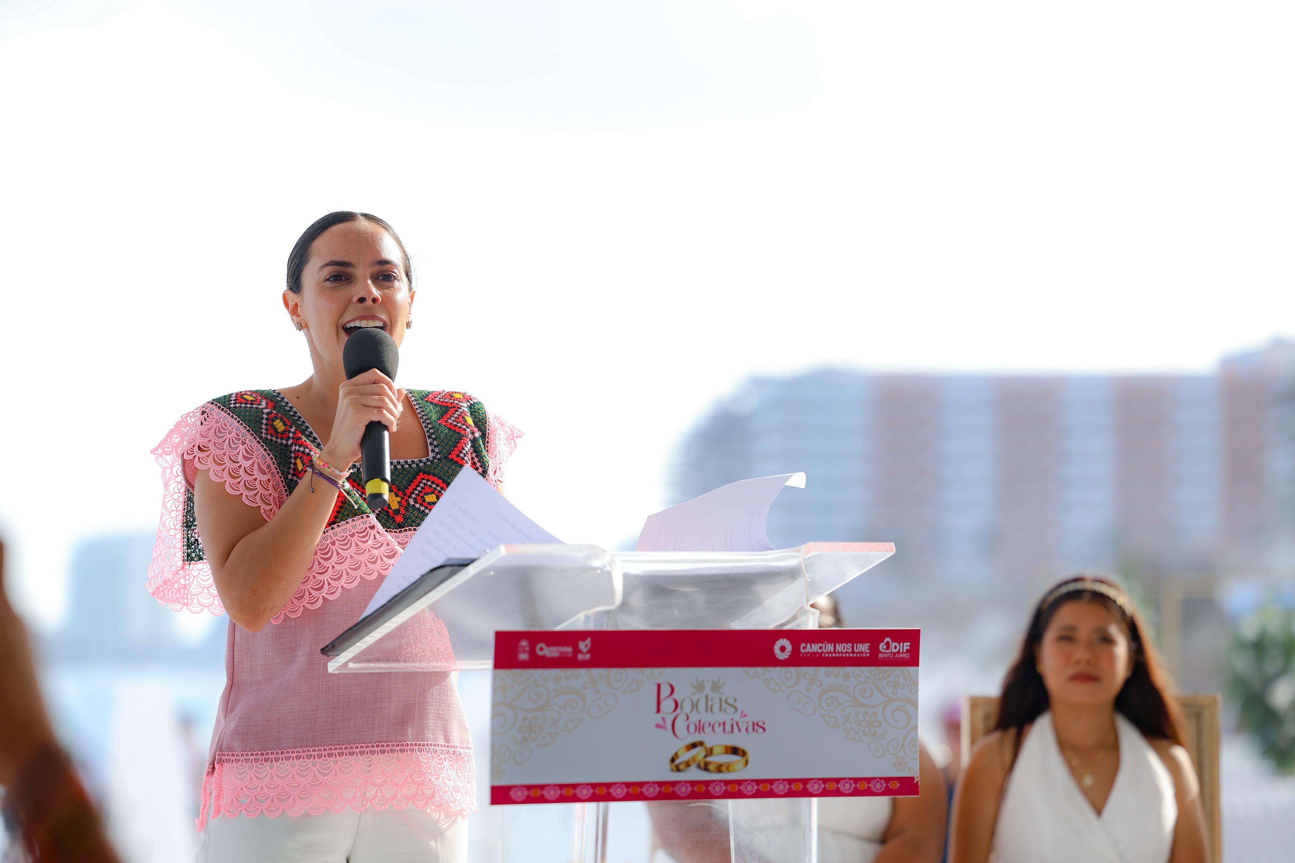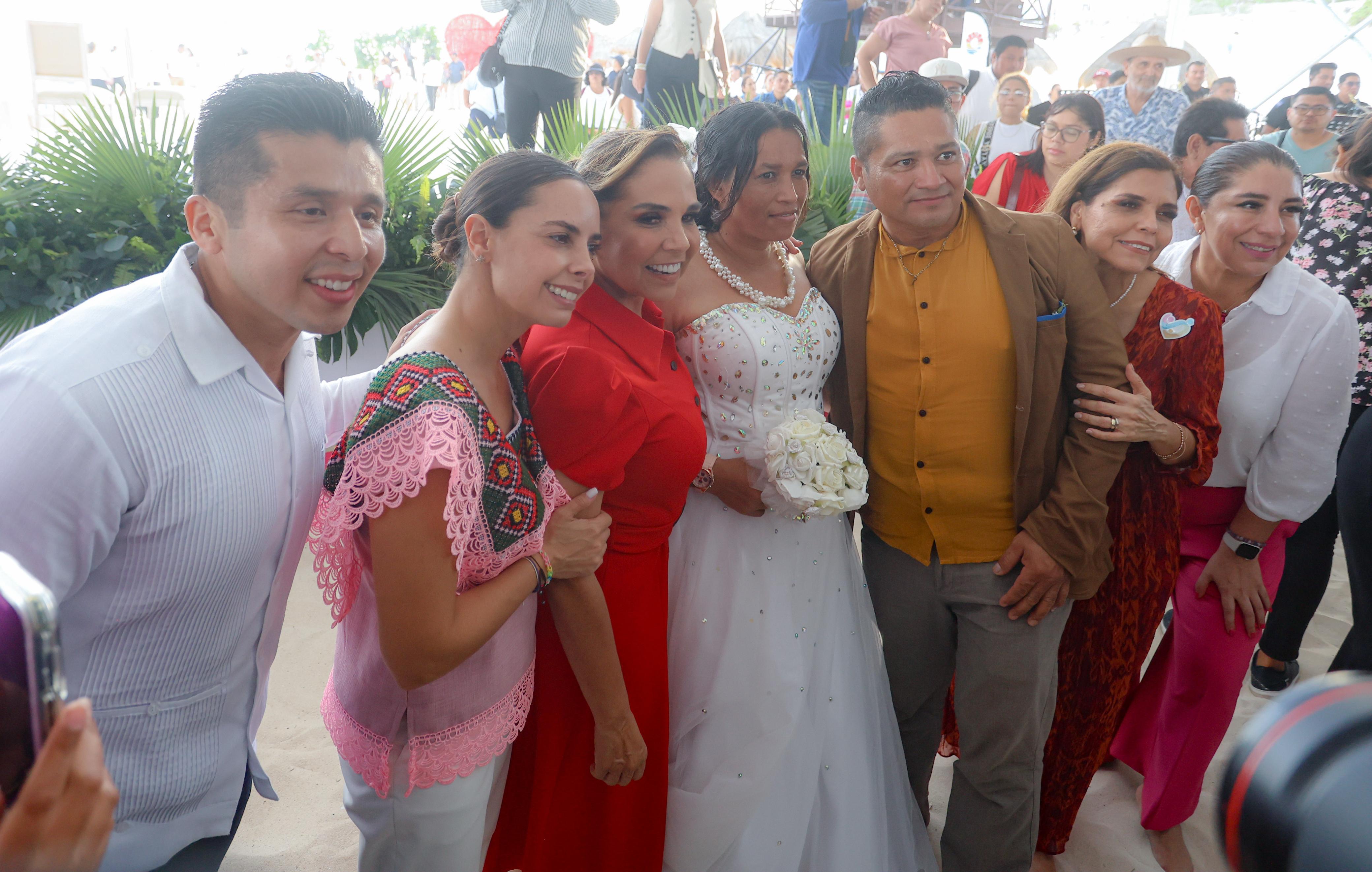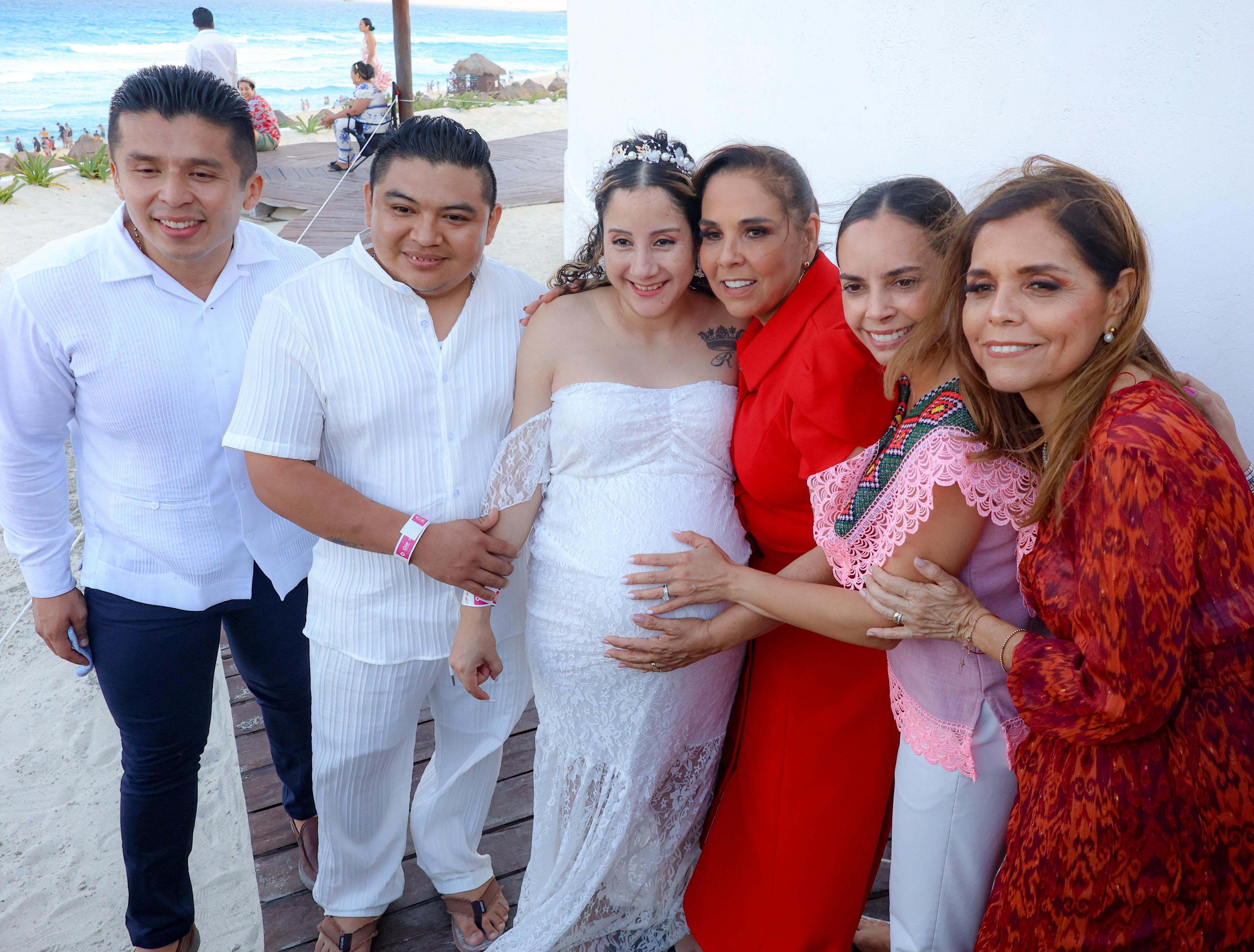 Cancún, Q. R., a 14 de febrero de 2025.- Bajo un atardecer espectacular, con el mar azul turquesa de fondo y en el marco del Día del Amor y la Amistad, la Presidenta Municipal, Ana Paty Peralta; la Gobernadora, Mara Lezama y la presidenta honoraria del DIF Quintana Roo, Verónica Lezama Espinosa, fungieron como testigos de honor en las Bodas Colectivas 2025 en la icónica Playa Delfines, donde 351 parejas cancunenses contrajeron nupcias en una ceremonia inolvidable.