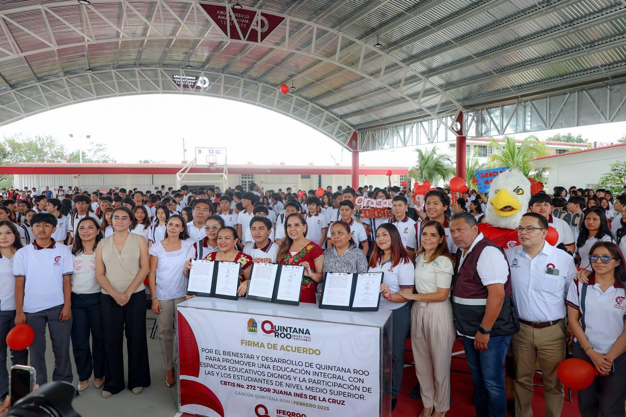 Cancún, Q. R., a 18 de febrero de 2025.- La Presidenta Municipal, Ana Paty Peralta, atestiguó la inauguración del domo de la cancha de usos múltiples del Centro de Bachillerato Tecnológico Industrial y de Servicios (CBTIS) 272 “Sor Juana Inés de la Cruz”, en la Supermanzana 255, encabezada por la Gobernadora, Mara Lezama, además de la firma del Acuerdo por el Bienestar y Desarrollo de Quintana Roo para Promover una Educación Integral, con espacios educativos dignos y la participación de las y los estudiantes de nivel medio superior.