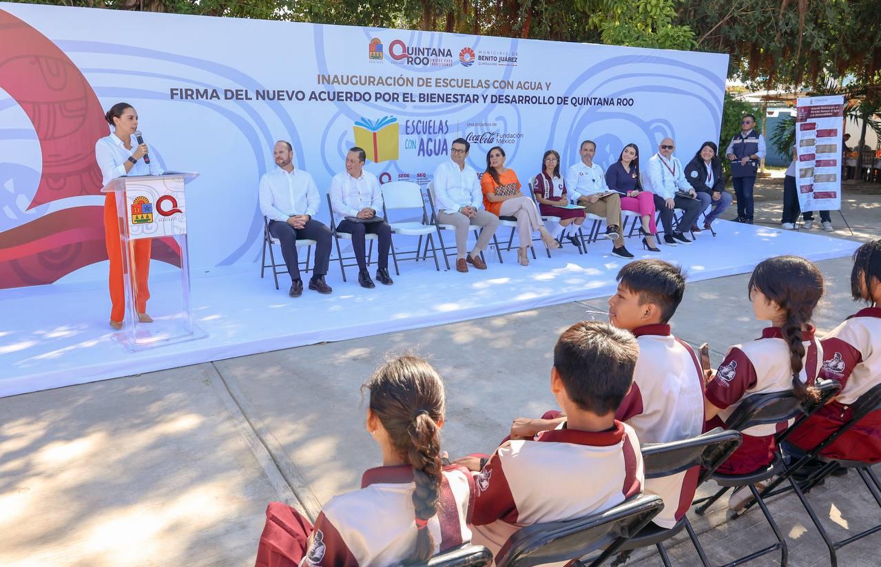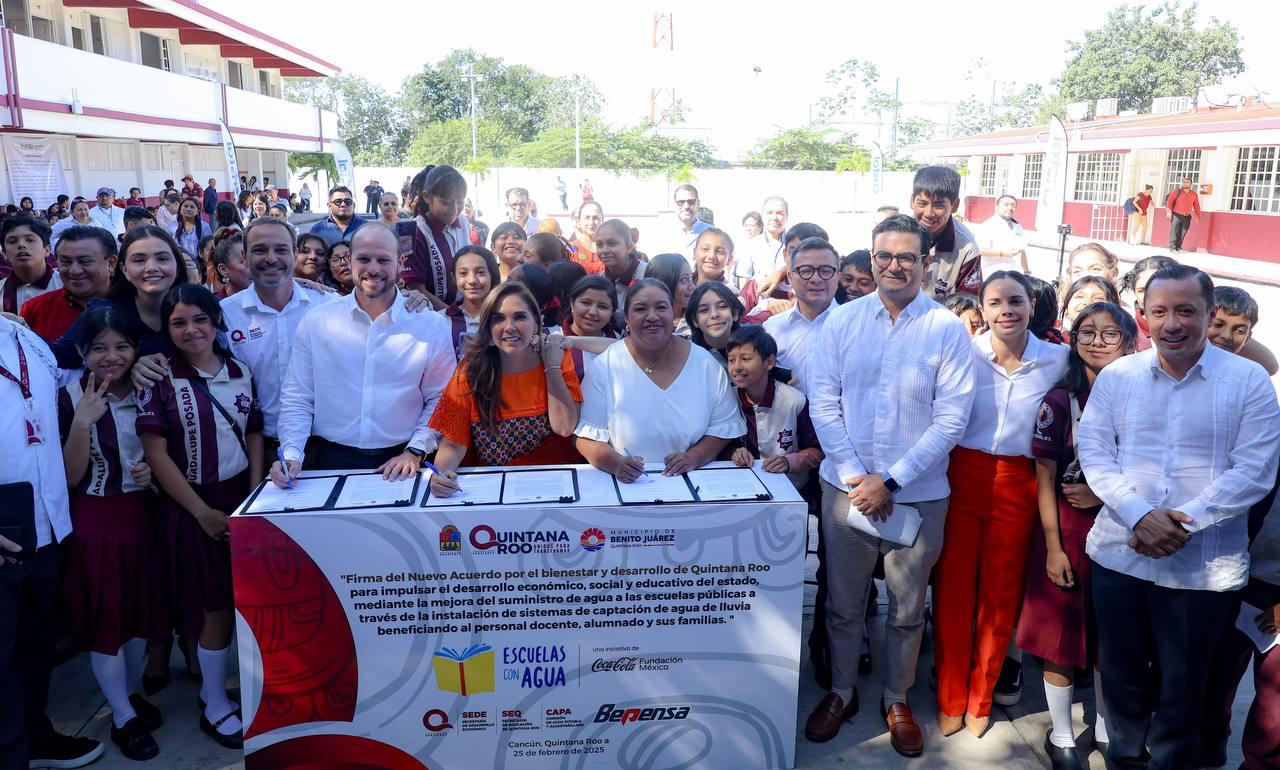 Cancún, Q. R., a 25 de febrero de 2025.- En el marco de la inauguración del programa “Escuelas con Agua” y firma del Nuevo Acuerdo por el Bienestar y Desarrollo de Quintana Roo, encabezadas por la gobernadora, Mara Lezama, la Presidenta Municipal, Ana Paty Peralta, reafirmó que en la construcción del futuro con responsabilidad ambiental se debe mantener el cuidado de los recursos naturales e hídricos para proteger el planeta.