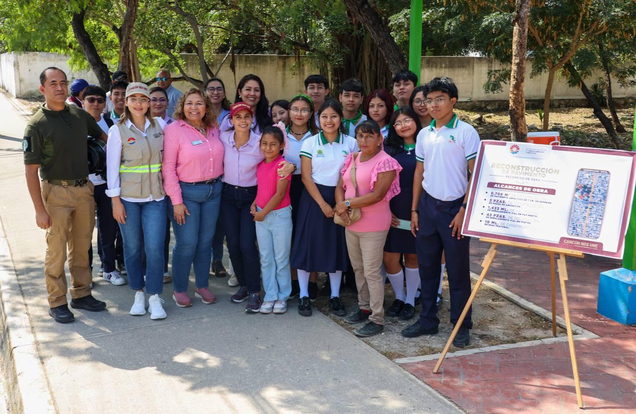 Cancún, Q. R., a 07 de marzo de 2025.- La Presidenta Municipal, Ana Paty Peralta, encabezó el recorrido de obra de la Reconstrucción de Pavimento en Calle 71, la cual se encuentra al 100 por ciento, la cual permite mantener una mejor circulación vial y seguridad para las y los estudiantes de la zona, al contar con un cruce peatonal cerca del del Colegio de Estudios Científicos y Tecnológicos (CECyTE) Cancún plantel I.