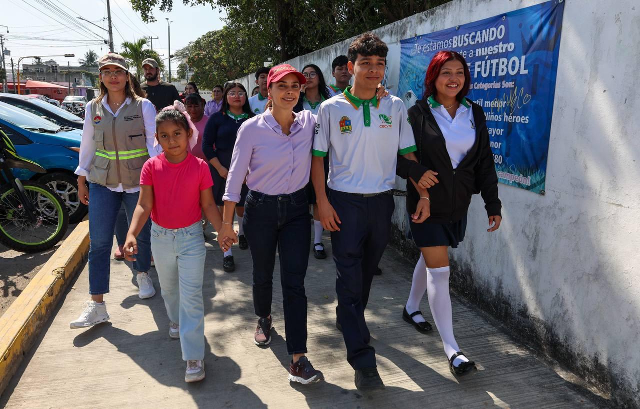Durante el recorrido, Ana Paty Peralta estuvo acompañada de la secretaria municipal de Obras Públicas y Servicios, Samantha Hernández Cardeña; la directora del CECyTE Plantel Cancún 1, Gladys Eneida Gómez Ku y alumnos, a quienes les explicó la importancia del paso peatonal que se colocó para beneficio de la comunidad estudiantil.