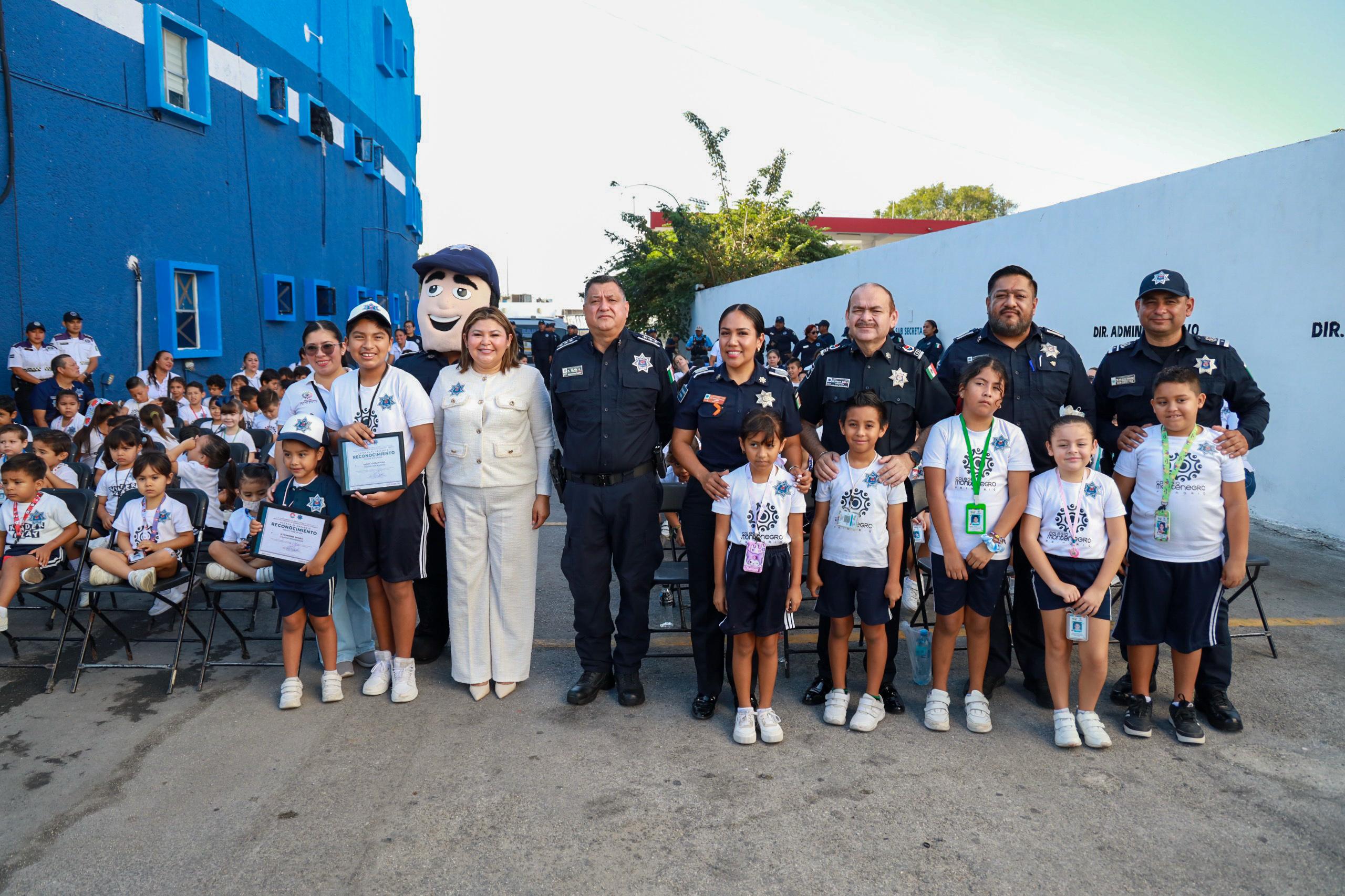 Cancún, Q. R., a 26 de marzo de 2025.- La Secretaría Municipal de Seguridad Ciudadana y Tránsito (SMSCyT) de Benito Juárez llevó a cabo la visita guiada "Policía por un Día", en la que participaron 124 estudiantes de preescolar y primaria del Colegio Montenegro, con el objetivo de fortalecer una percepción positiva de la función policial en la sociedad.