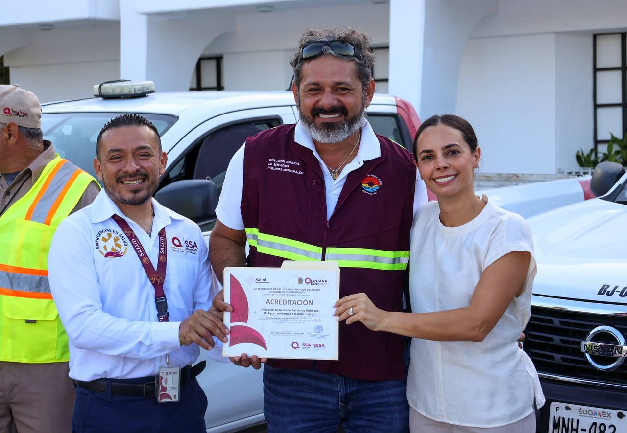 Cancún, Q. R., a 04 de abril de 2025.- “Hoy concluye la 1era Jornada Nacional de Lucha contra el Dengue y otras Arbovirosis 2025 y queremos compartirles con mucho orgullo que el Palacio Municipal y otras cinco dependencias más reciben el certificado de espacios libres de dengue”, anunció la Presidenta Municipal, Ana Paty Peralta, lo que coloca a Benito Juárez como primer municipio en la entidad en obtener dicho distintivo, de acuerdo con la Secretaría de Salud (SSA) y los Servicios Estatales de Salud (SESA).