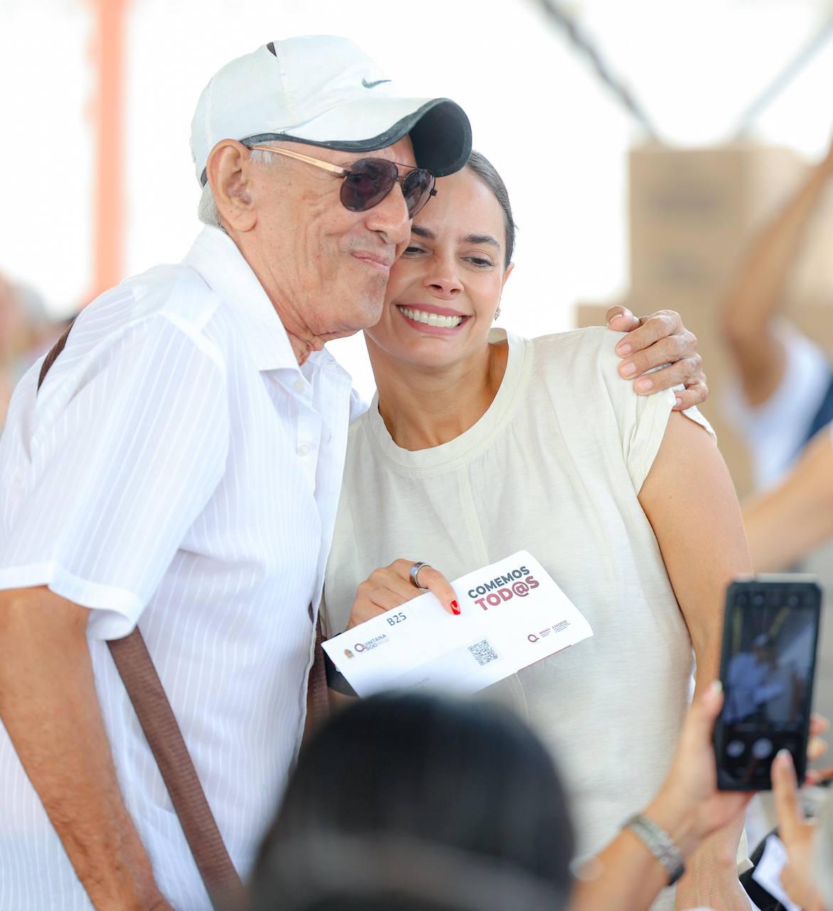 Cancún, Q. R., a 23 de abril de 2025.- “Sepan que no están solos, aquí hay un gobierno estatal que los respalda y un gobierno municipal que los acompaña. Vamos a seguir trabajando unidas y unidos para que las familias vivan mejor y tengan una calidad de vida digna”, aseguró la Presidenta Municipal, Ana Paty Peralta, al atestiguar la entrega de 700 apoyos alimentarios en especie y tarjetas monetarias del programa “Comemos Todos” de manos de la Gobernadora, Mara Lezama.