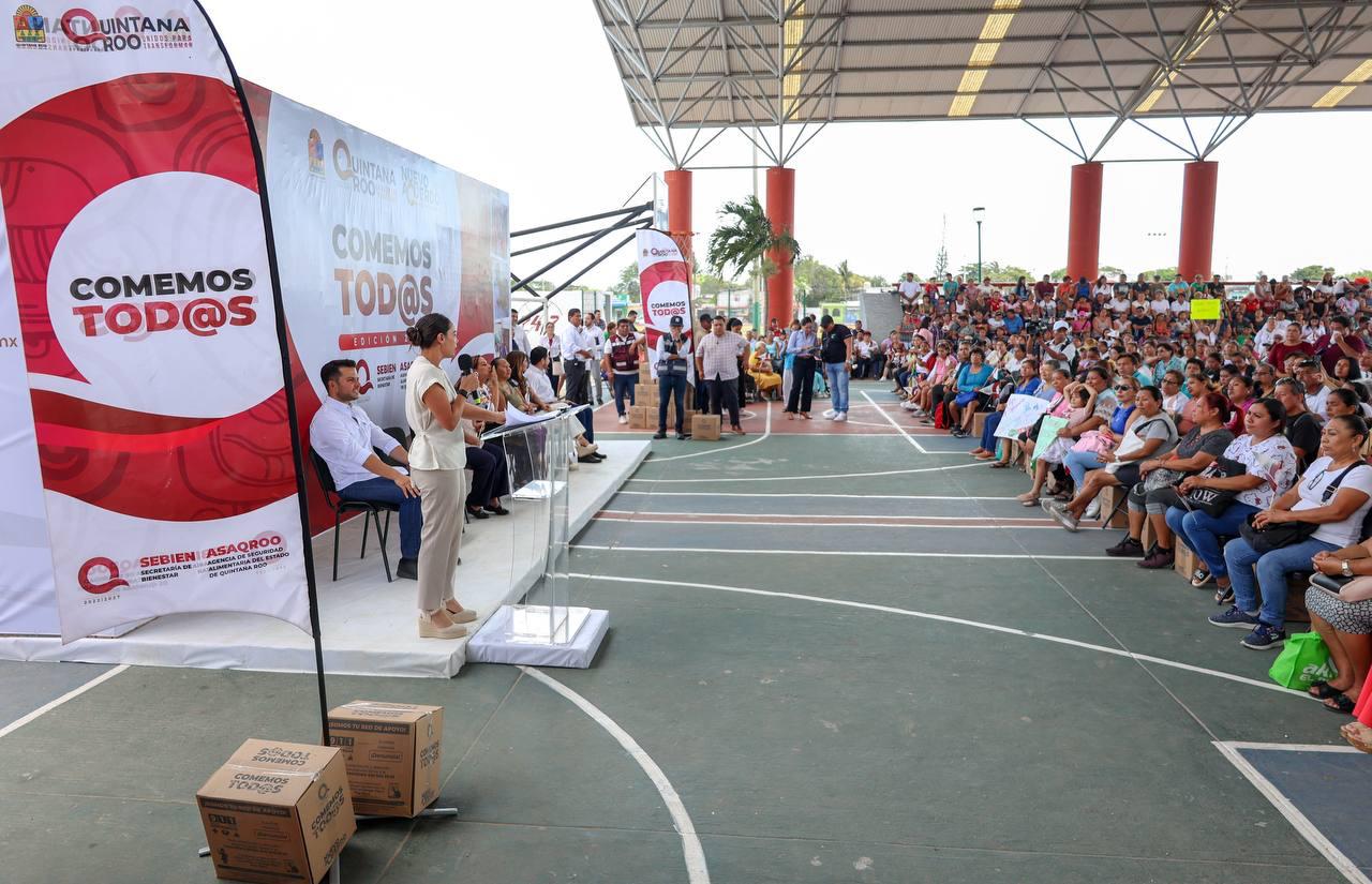 Desde la unidad deportiva José María Morelos, la Primera Autoridad Municipal destacó que con este programa se reafirma el compromiso de la Gobernadora, de apoyar a los que más lo necesitan, no solo con alimento en la mesa, sino que también con justicia social y bienestar.