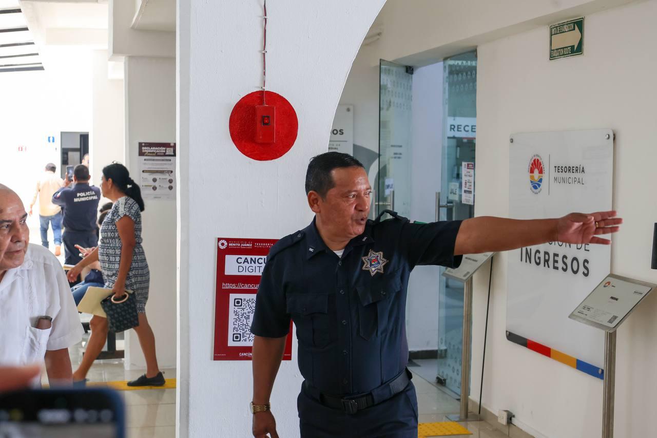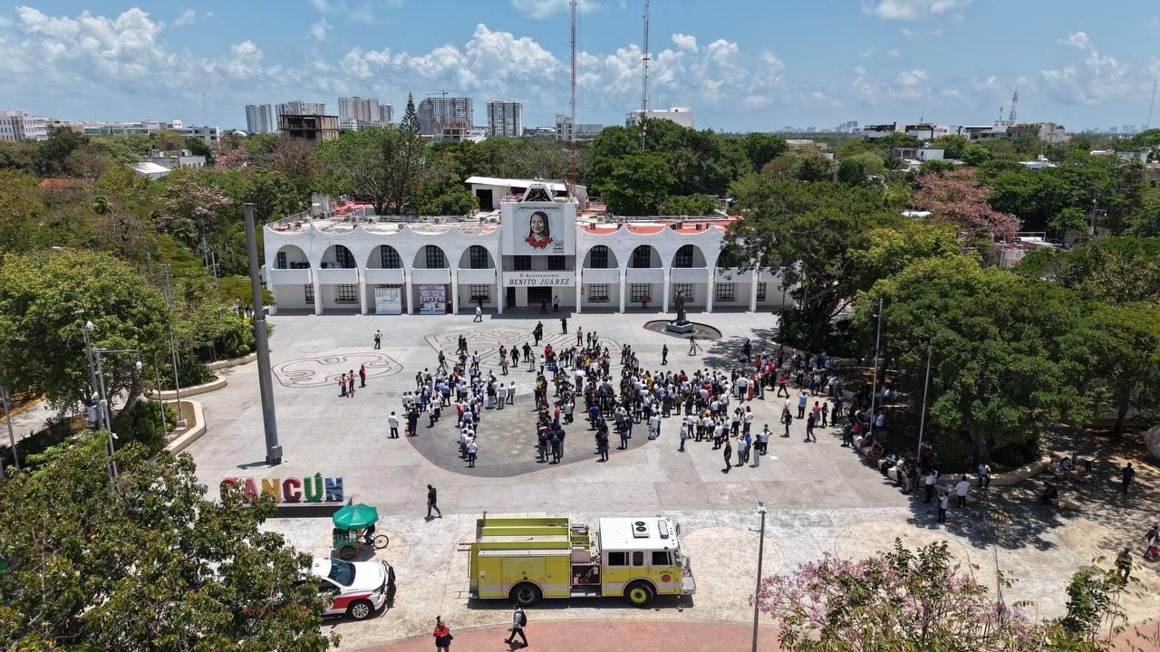 Cancún, Q. R., a 29 de abril de 2025.- En el marco del 40 aniversario del sismo de 1985, el Ayuntamiento de Benito Juárez participó en el Primer Simulacro Nacional 2025, con 212 personas, entre voluntarios, autoridades municipales y primeros respondientes de las corporaciones de emergencia, mediante la hipótesis de un incendio registrado en el Palacio Municipal, más 525 comercios y empresas en el municipio, que realizaron este ejercicio de prevención.