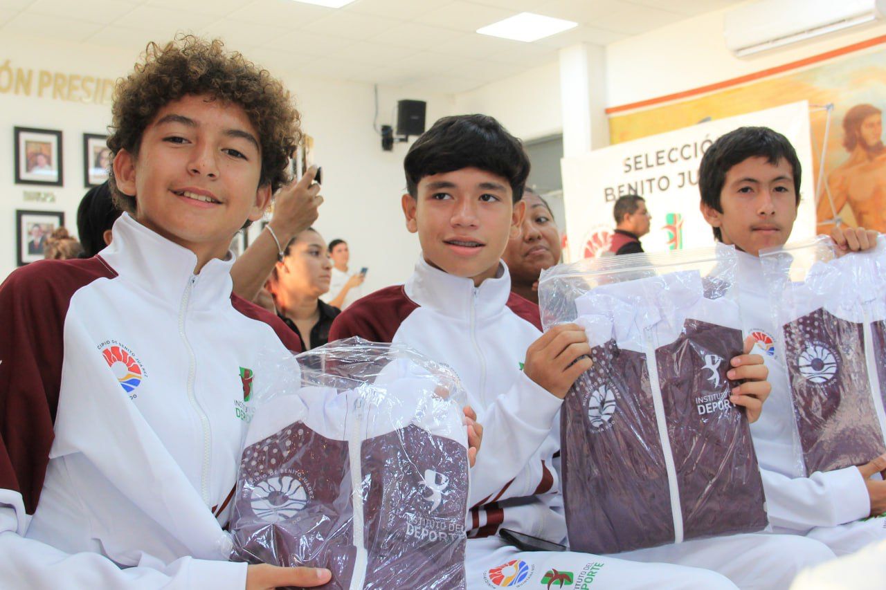 Cancún Q. R., a 06 de julio de 2023.- A fin de ofrecer identidad, uniformidad, presentación y como incentivo por su gran esfuerzo y dedicación, la Presidenta Municipal de Benito Juárez, Ana Paty Peralta, en compañía del director del Instituto Municipal del Deporte, Alejandro Luna López, realizó la entrega de uniformes a deportistas del equipo Leones Negros del Colegio Valladolid Fútbol Club, quienes representarán al municipio en el Torneo de la Copa Internacional Ghotia Cup 2023 que se llevará a cabo este mes en Suecia.