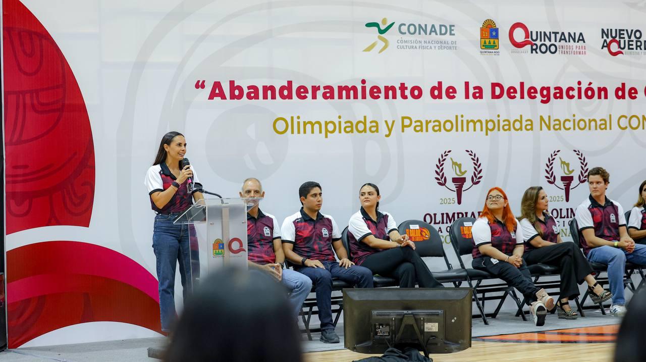 Cancún, Q.R., a 14 de mayo de 2025.- En apoyo de los jóvenes atletas de varias disciplinas, la Presidenta Municipal, Ana Paty Peralta, estuvo en el abanderamiento de 783 atletas que forman parte de la delegación deportiva quintanarroense que participará en la Olimpiada y Paraolimpiada Nacional de la Comisión Nacional de Cultura Física y Deporte (CONADE) 2025, a realizarse del 14 de mayo al 13 de julio en Tlaxcala, Jalisco, Colima, Yucatán y Puebla.