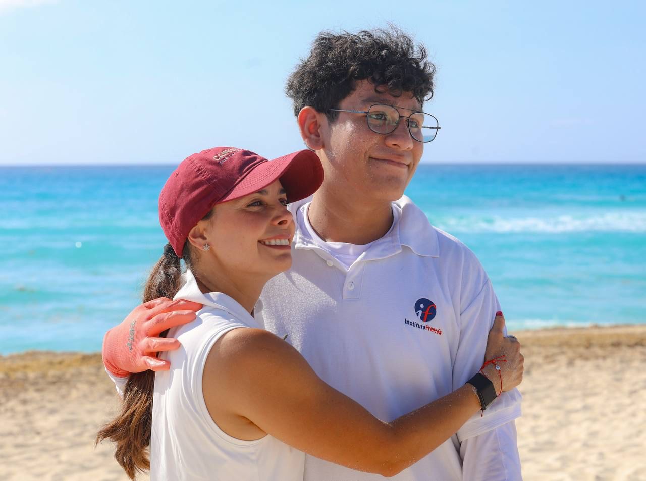 Cancún, Q. R., a 31 de mayo de 2025.- La Presidenta Municipal, Ana Paty Peralta, junto a jóvenes y docentes del Instituto Francés, realizaron una brigada de limpieza en Playa Delfines, para fomentar la cultura del cuidado del medio ambiente entre los cancunenses, y mantener la belleza de las playas de Cancún, las cuales son reconocidas en todo el mundo.