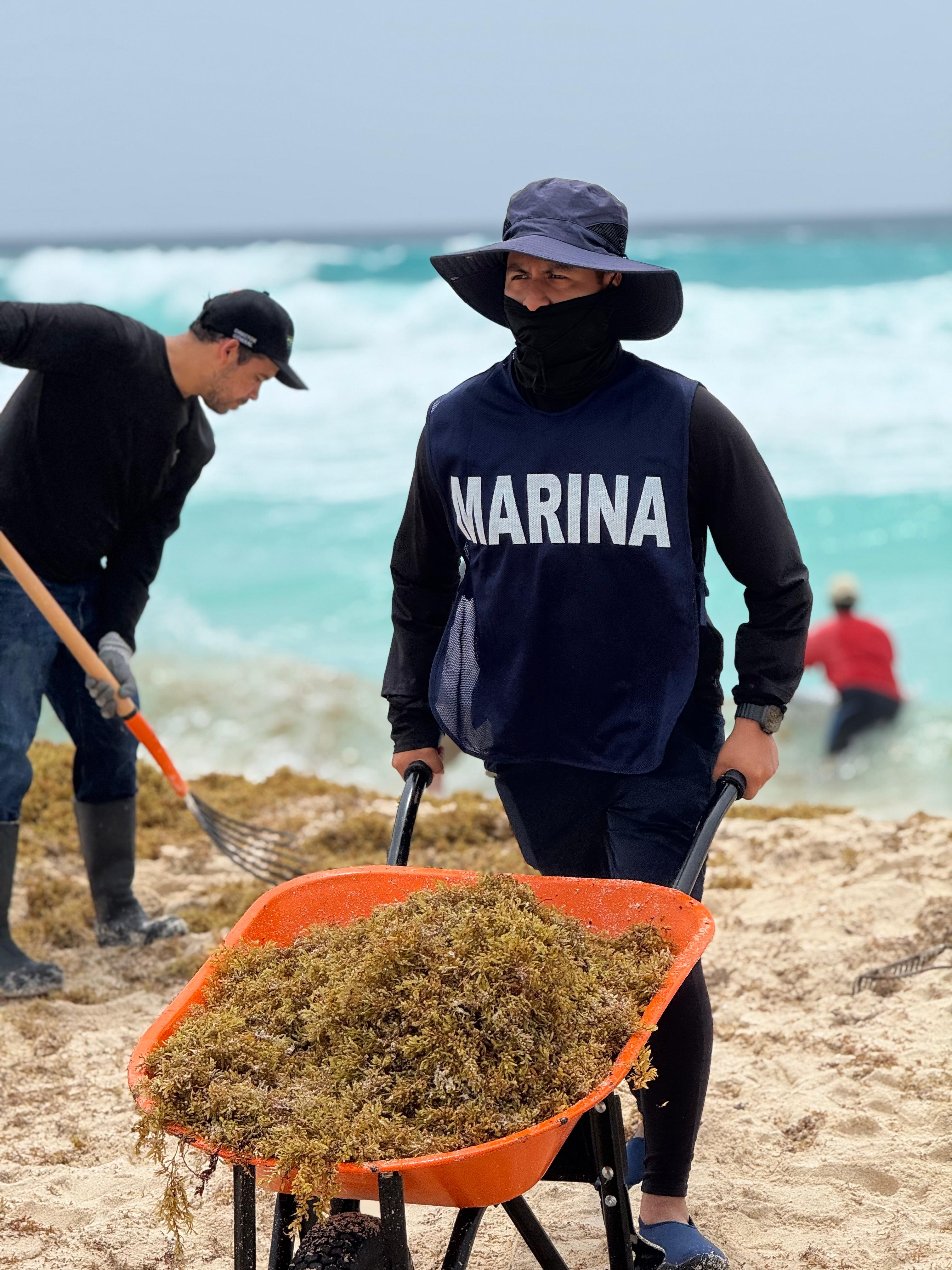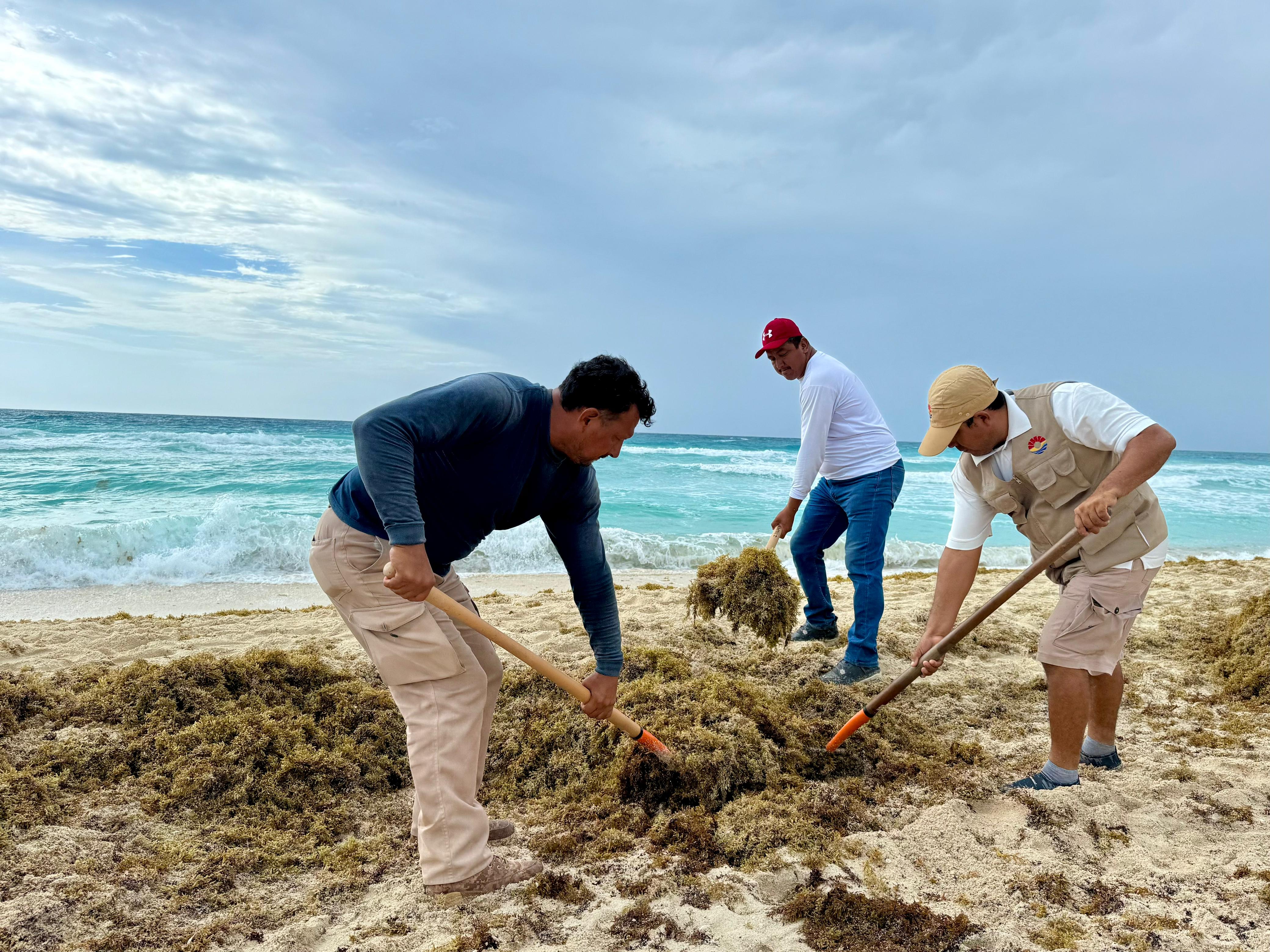 De acuerdo con el reporte de este jueves, solo tres playas registraron un arribo considerable de sargazo, Chac Mool, Ballenas y Marlín, y en estas dos últimas ya se encuentra controlado el arribo. Además, se cuenta con una celda especial para el destino final de esta microalga, con todas las características para evitar la contaminación del suelo.