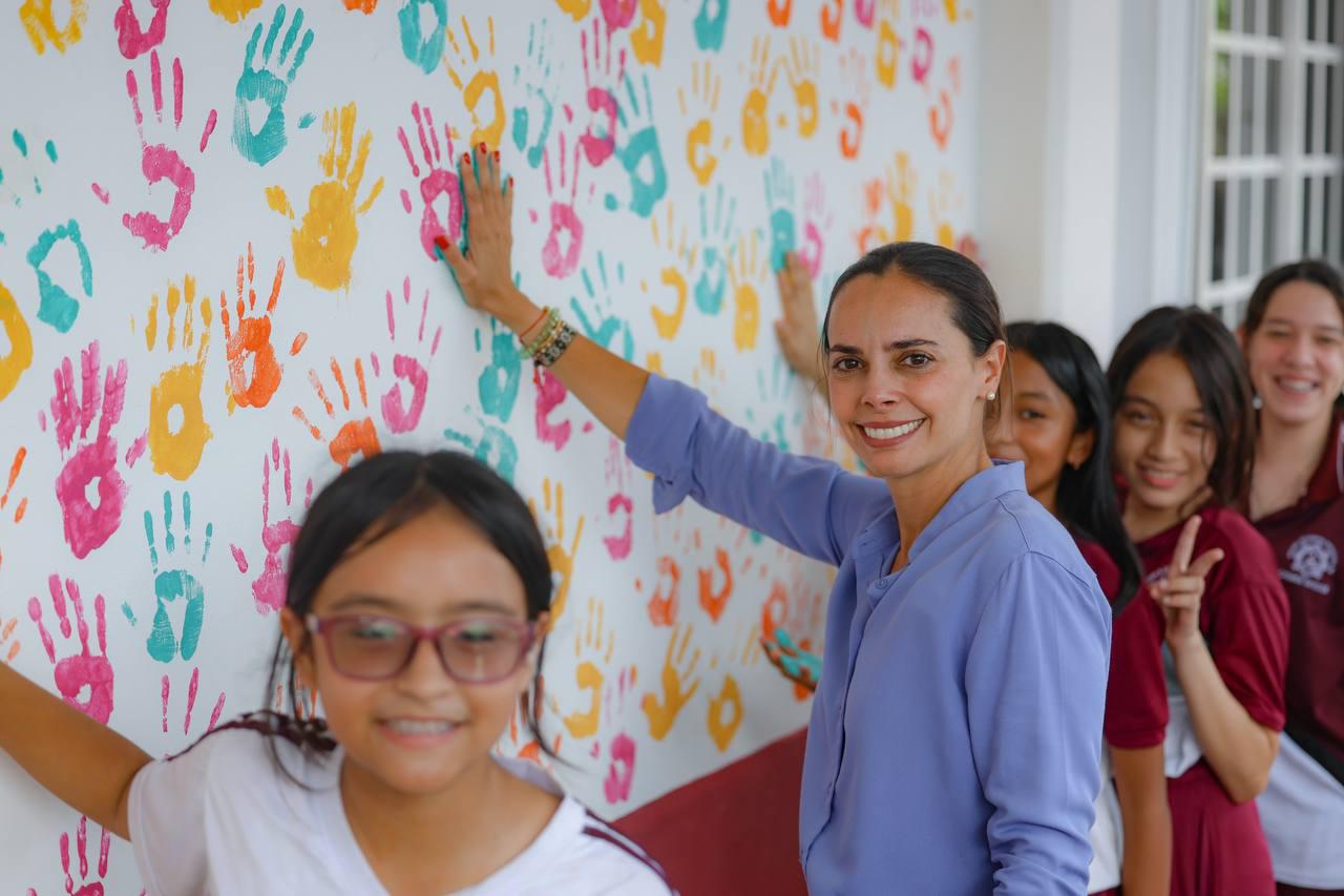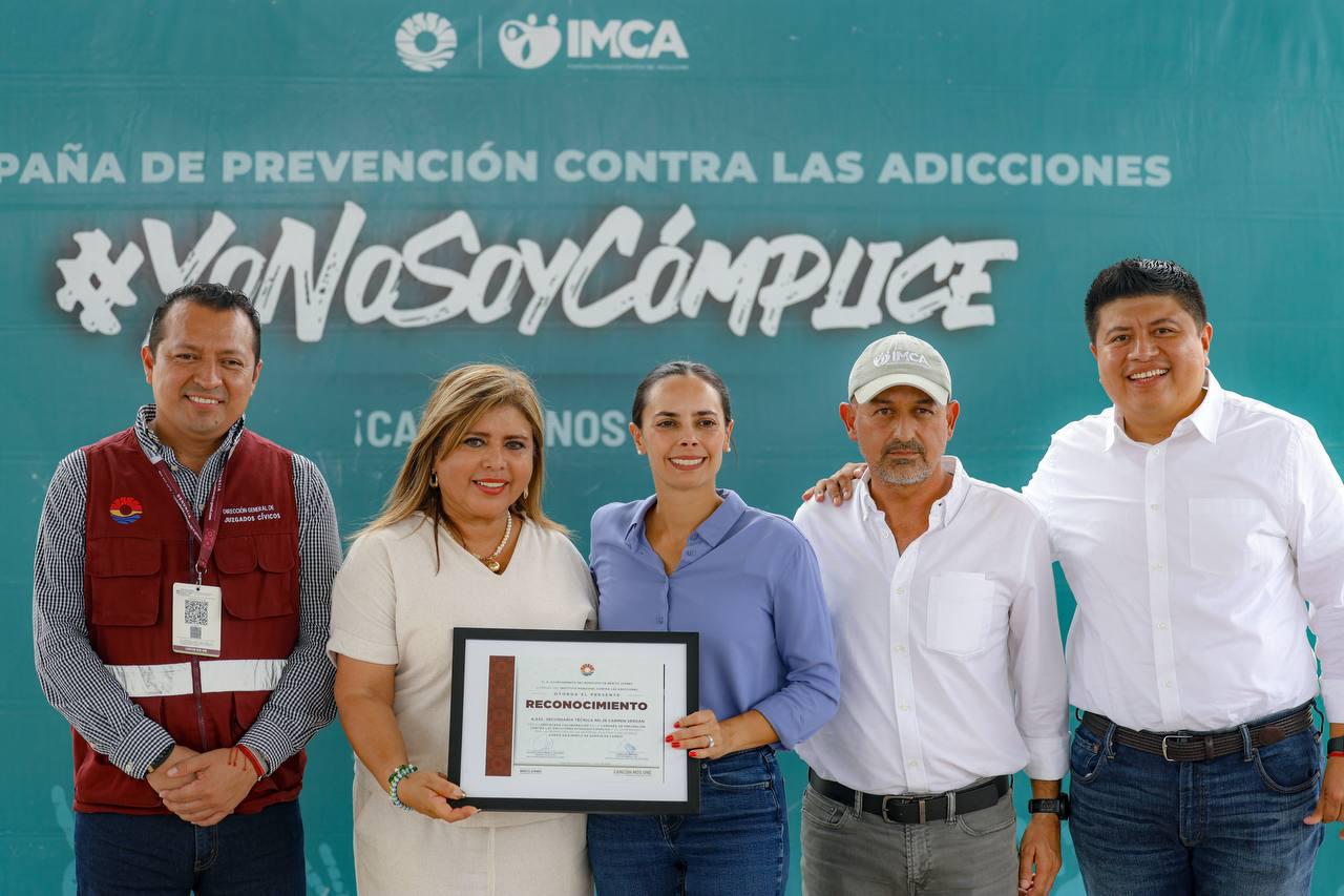 Como parte de las actividades a cargo del Instituto Municipal contra las Adicciones (IMCA), se llevó a cabo la colocación de señalética con la campaña de valores, pláticas de concientización sobre el tema, así como el mural “Yo no soy cómplice”, en el que los estudiantes plasmaron las huellas de sus manos con pintura de colores, a lo que se sumó la Presidenta Municipal.