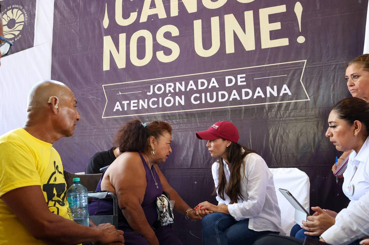 Cancún, Q. R., a 03 de julio de 2025.- “Atendemos como siempre a las y los cancunenses que se acercan con diferentes peticiones, requerimientos, solicitudes, gestiones que también hacemos con otras instancias federales y estatales”, expresó la Presidenta Municipal, Ana Paty Peralta, al encabezar la Jornada de Atención Ciudadana “¡Cancún nos une!”, en el domo de la Supermanzana 232.