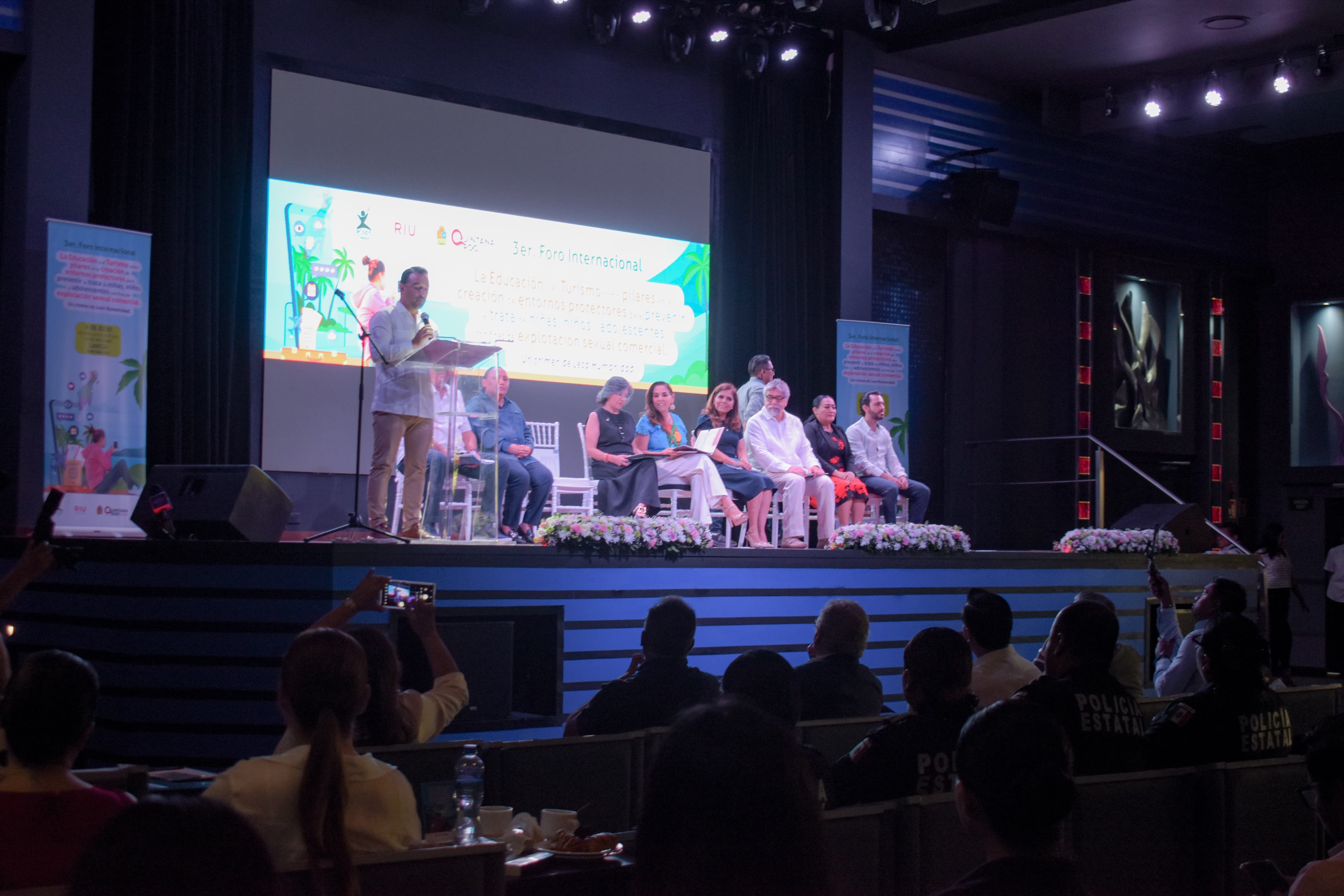 Cancún, Q. R., a 04 de julio de 2025.- En representación de la Presidenta Municipal, Ana Paty Peralta, el secretario general del Ayuntamiento, Pablo Gutiérrez Fernández, participó en la inauguración del Tercer Foro Internacional “La educación y el turismo como pilares en la creación de entornos protectores para prevenir la trata de niñas, niños y adolescentes con fines de explotación sexual comercial”, encabezado por la Gobernadora, Mara Lezama.