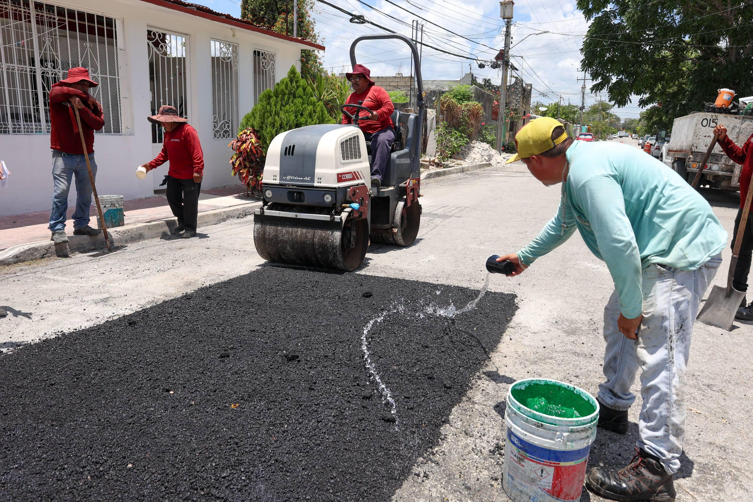 Desde su llegada a la calle 135, con calle 42 poniente, la Primera Autoridad Municipal agradeció la labor de 16 personas que conforman la Brigada de Bacheo, quienes realizan los trabajos en el lugar, donde fueron empleados cuatro metros cúbicos de asfalto frío, para generar una carpeta de cinco centímetros de espesor, con maquinaria Bobcat y rodillo compactador.