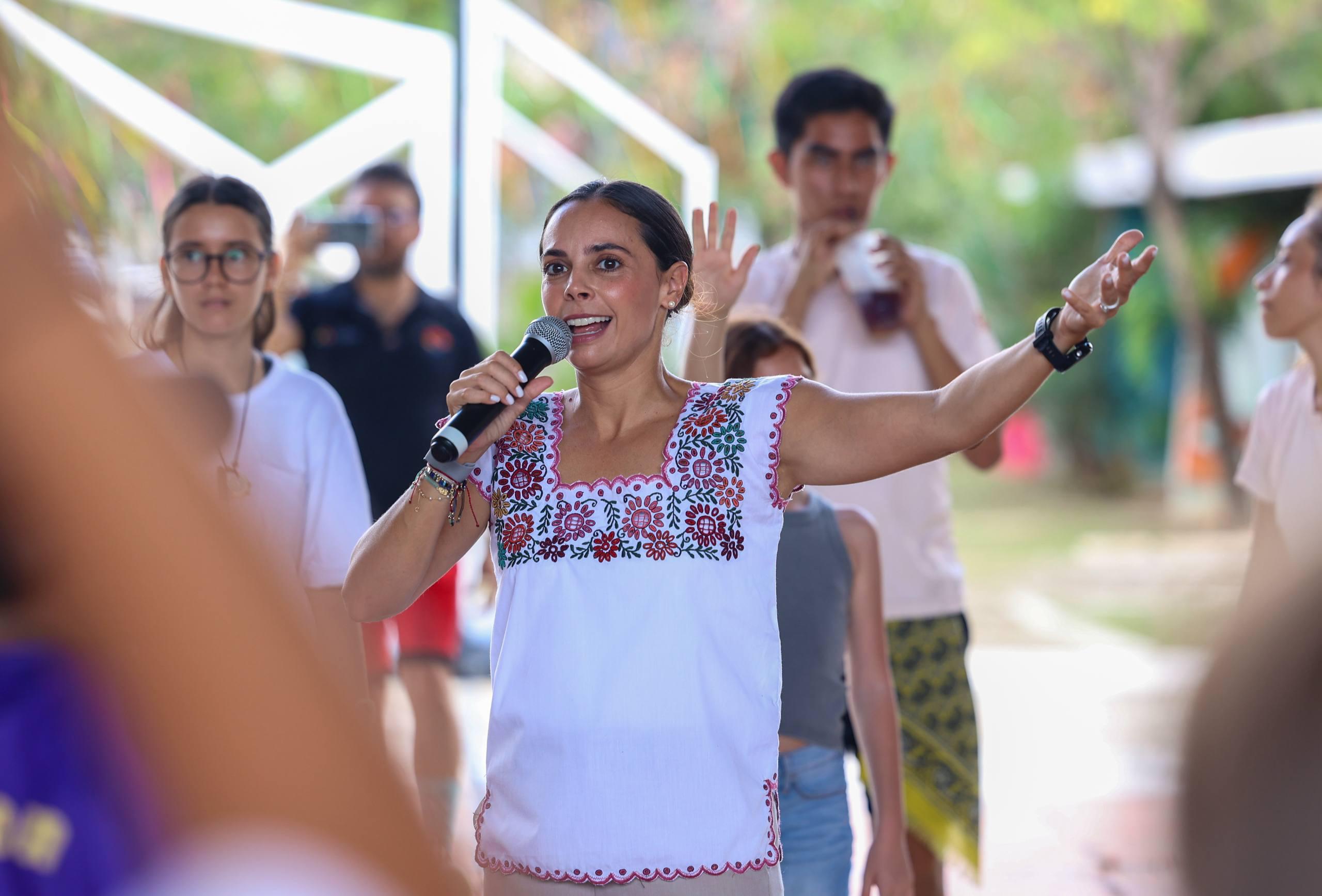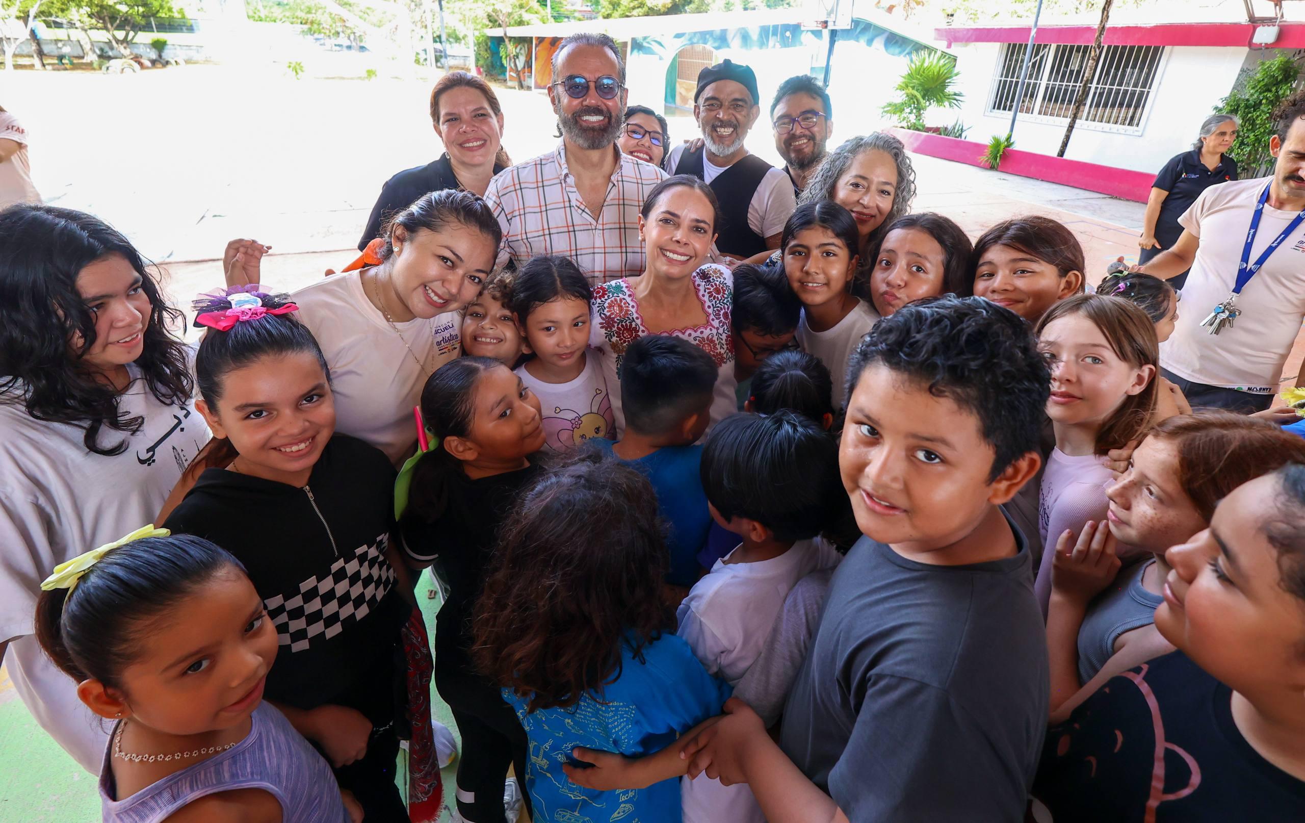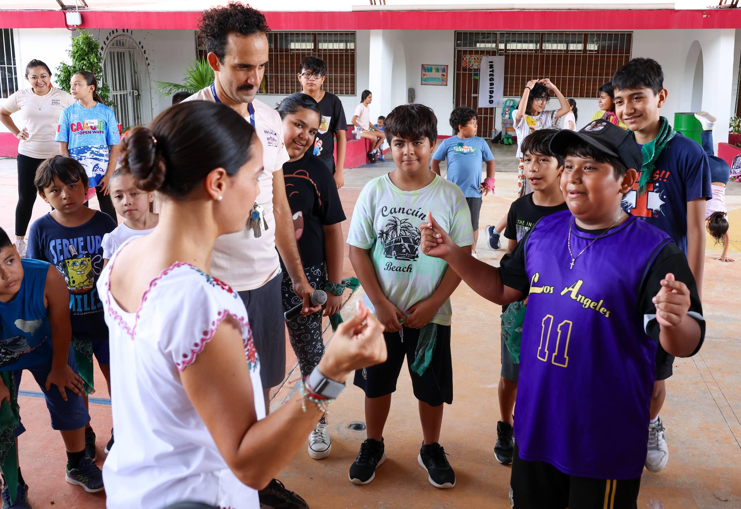 Cancún, Q. R., a 14 de agosto de 2025.- La Presidenta Municipal, Ana Paty Peralta, visitó a las 75 niñas y niños del Curso de Verano “Verano con mi Tribu”, que realiza el Instituto de la Cultura y las Artes, en la Escuela de Iniciación Artística, donde los niños exploraron, experimentaron y se expresaron libremente su imaginación con habilidades artísticas en talleres creativos de teatro, música, danza, artes visuales, escritura creativa y juegos y trabajo en equipo.