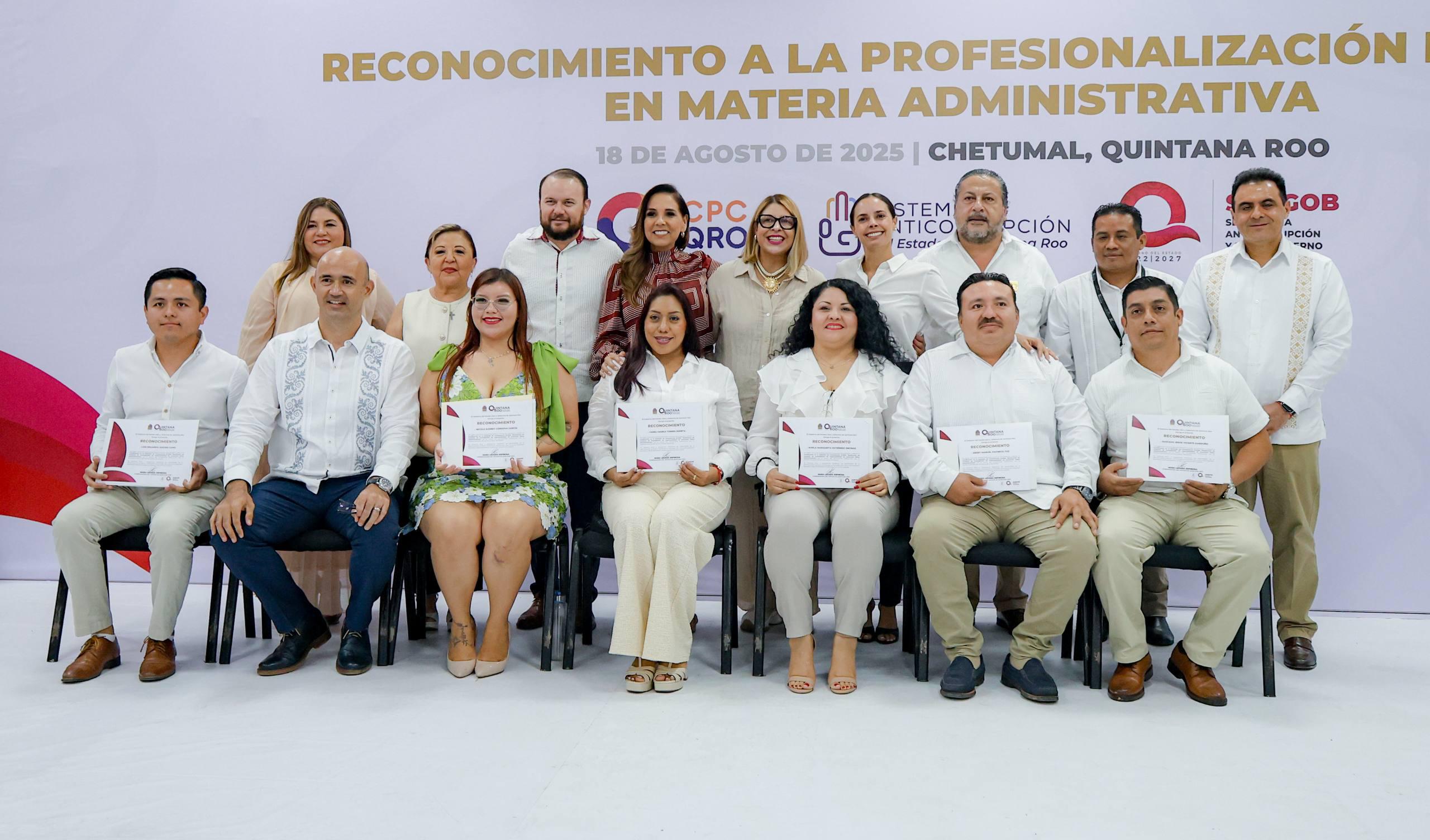 Chetumal, Q. R., 18 de agosto de 2025.- La Presidenta Municipal, Ana Paty Peralta, atestiguó la entrega de reconocimientos a la profesionalización pública en materia administrativa para 123 representantes de los 11 municipios, por parte de la Secretaría Anticorrupción y Buen Gobierno del Estado de Quintana Roo (SABGOB), como sinónimo del cumplimiento que realizan a las políticas públicas en materia de integridad y transparencia.