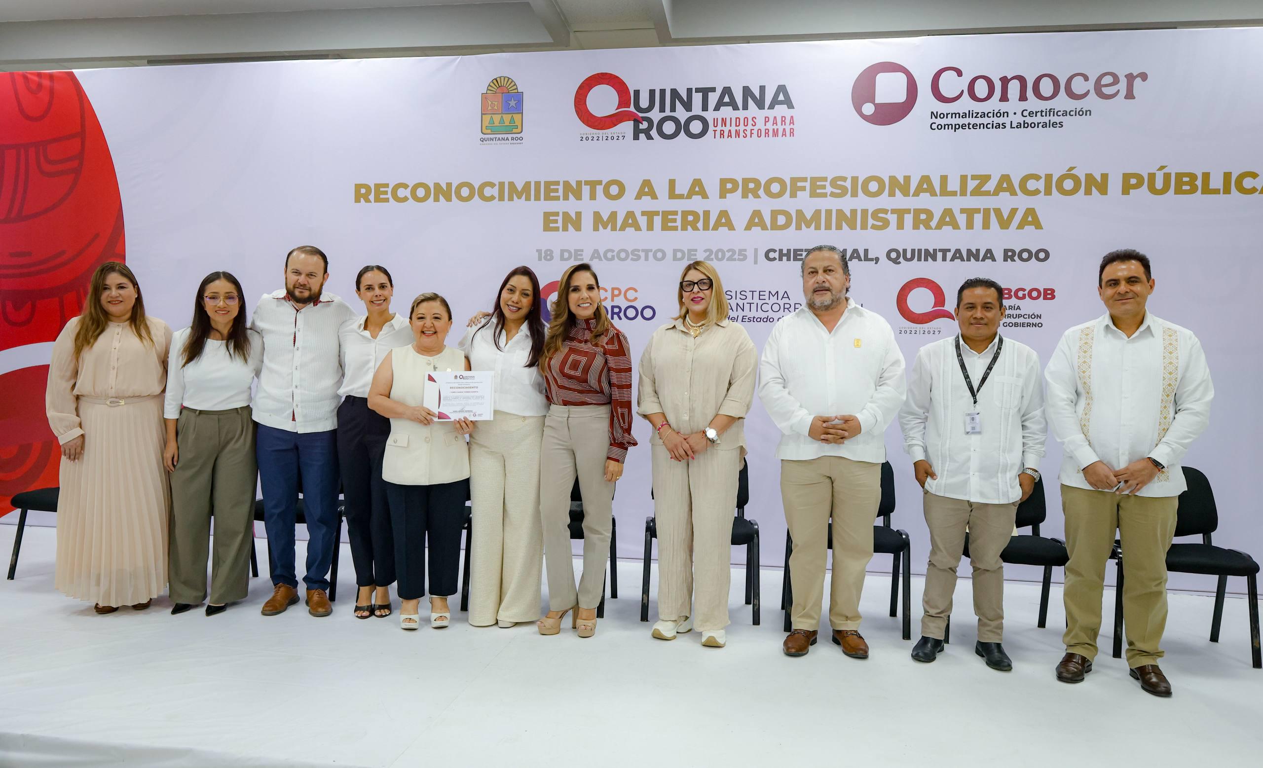 En el marco del evento realizado en la capital del estado, Ana Paty Peralta destacó que el distintivo para Benito Juárez fue recibido por personal de Ingresos y de la Contraloría Municipal, de manos de la gobernadora Mara Lezama, luego de haber logrado la certificación en el Estándar de Competencia EC1556: “Realización de Acciones de Investigación de Responsabilidad de Faltas Administrativas”, a través del Consejo Nacional de Normalización y Certificación de Competencias Laborales (CONOCER).