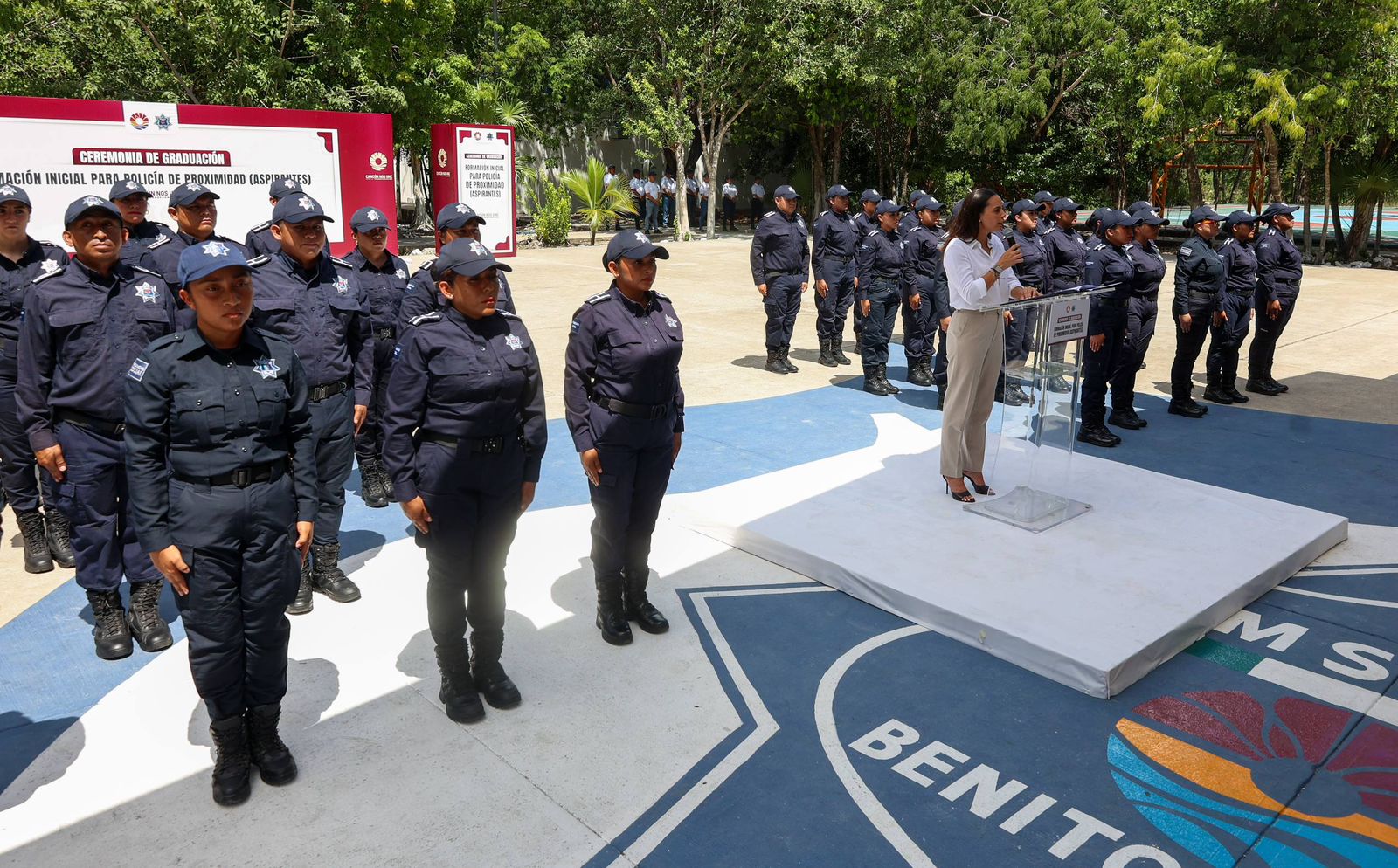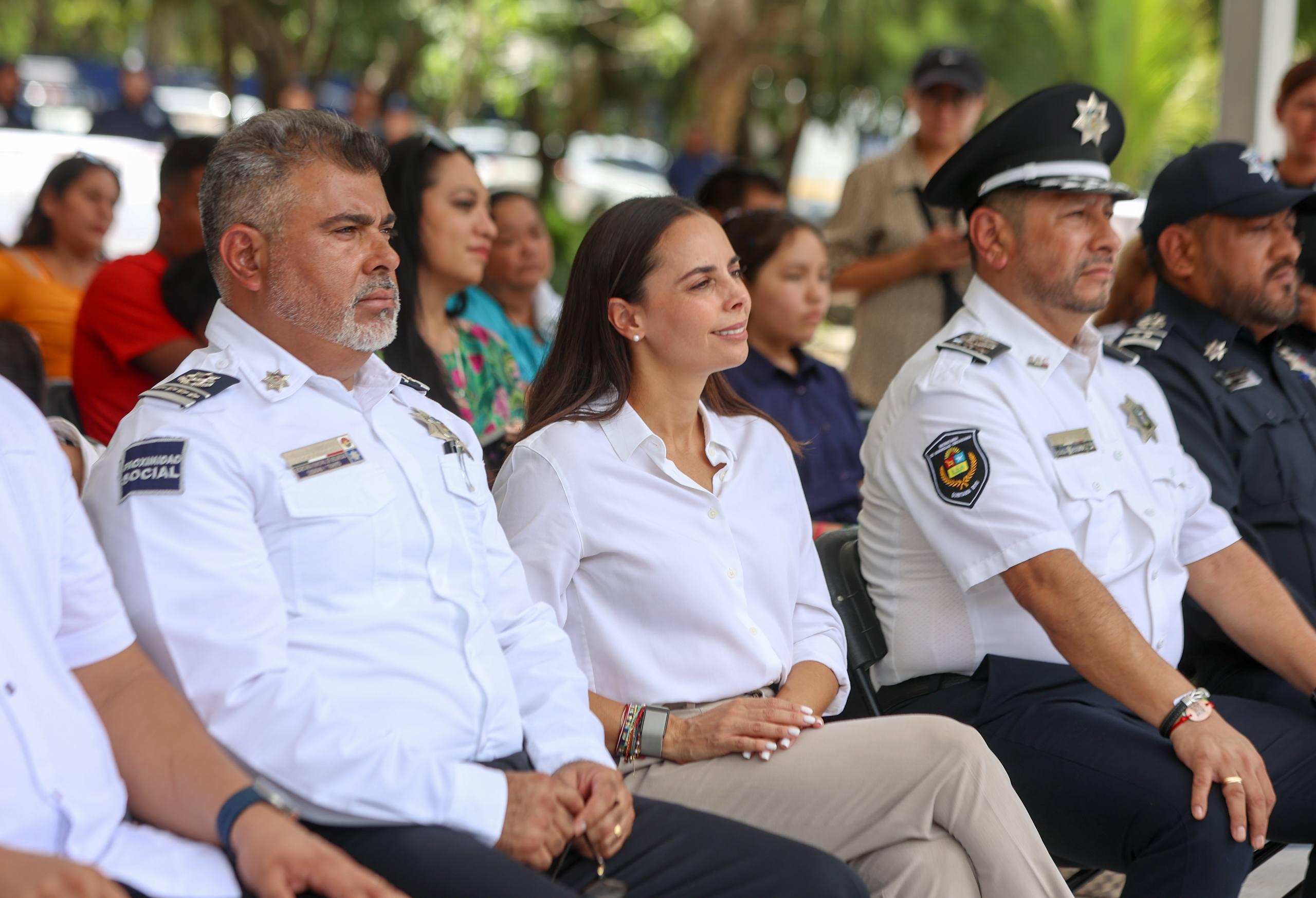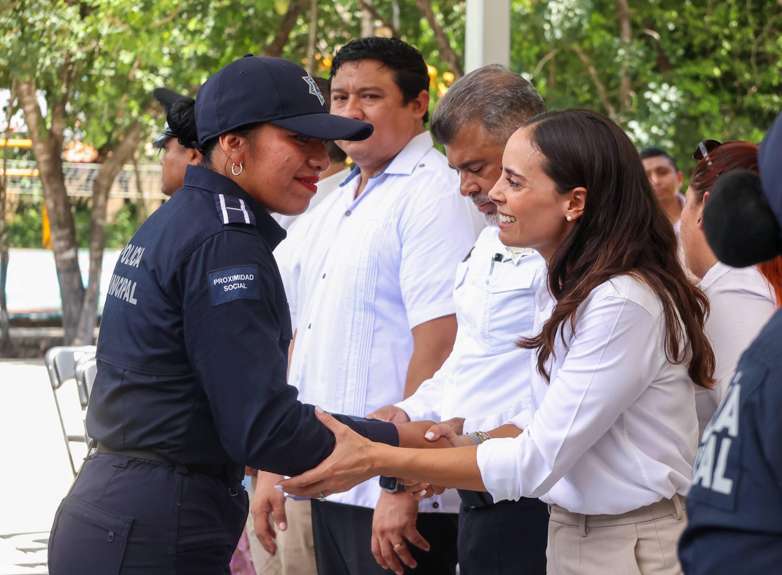 En el evento, al que asistieron familiares de los nuevos policías, la Alcaldesa reconoció que 27 de los egresados son mujeres. “Estamos transformando nuestra perspectiva de género, con mujeres valientes y firmes; es fruto de una estrategia integral liderada por nuestra presidenta, Claudia Sheinbaum Pardo, nuestra primera mujer Presidenta de México, respaldada desde el gobierno del estado, nuestra primera mujer gobernadora Mara Lezama, ahora ustedes son parte de esta estrategia, pero lo más valioso es la conducta y el compromiso de cada policía”, dijo.
