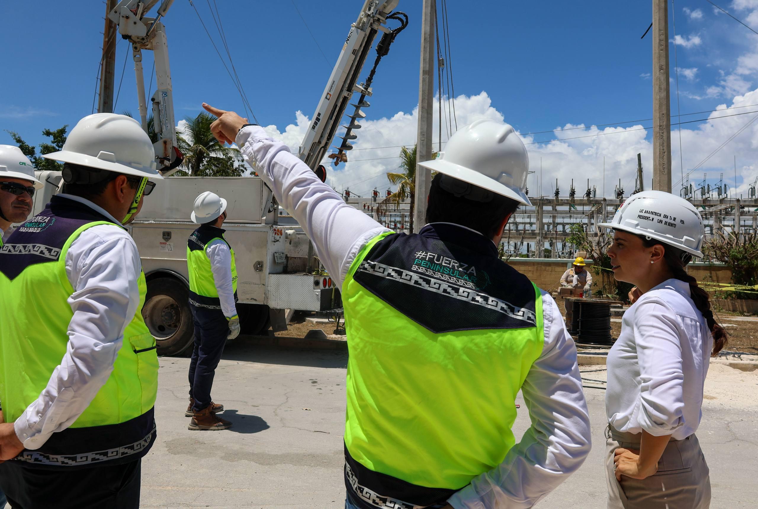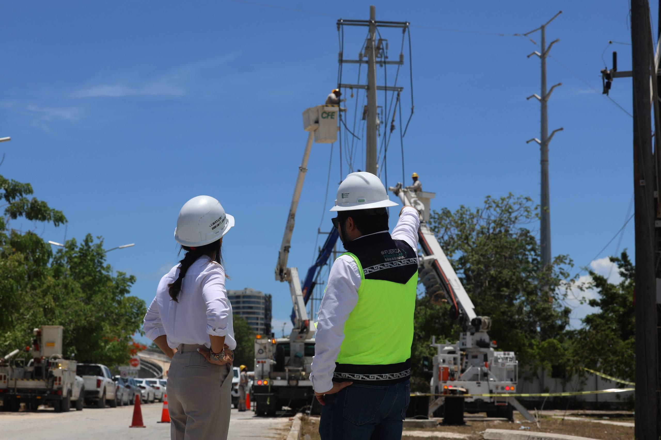 Acompañada por el gerente de División Peninsular de la CFE Distribución, Héctor Aguilar Valenzuela, la Primera Autoridad Municipal destacó que ante las interrupciones en el suministro de energía eléctrica en diversas zonas de la ciudad, sobre todo en Polígono Sur, se ha tenido comunicación con el superintendente de la CFE en la Zona Norte Cancún, Héctor Raúl Pérez Arjona y personal de la empresa, para solucionar esta problemática, por lo que agradeció el trabajo en equipo.