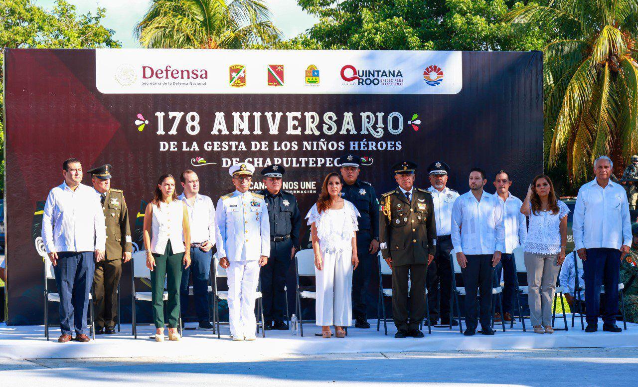 Cancún, Q. R., a 13 de septiembre de 2025.- La Presidenta Municipal, Ana Paty Peralta y la Gobernadora, Mara Lezama, encabezaron la ceremonia conmemorativa por el 178 aniversario de la Gesta Heroica de los Niños Héroes, donde autoridades de los tres órdenes gobierno, fuerzas militares, instituciones educativas y ciudadanos rindieron homenaje a los cadetes que en 1847, defendieron con valentía la soberanía nacional frente al ejército estadounidense.