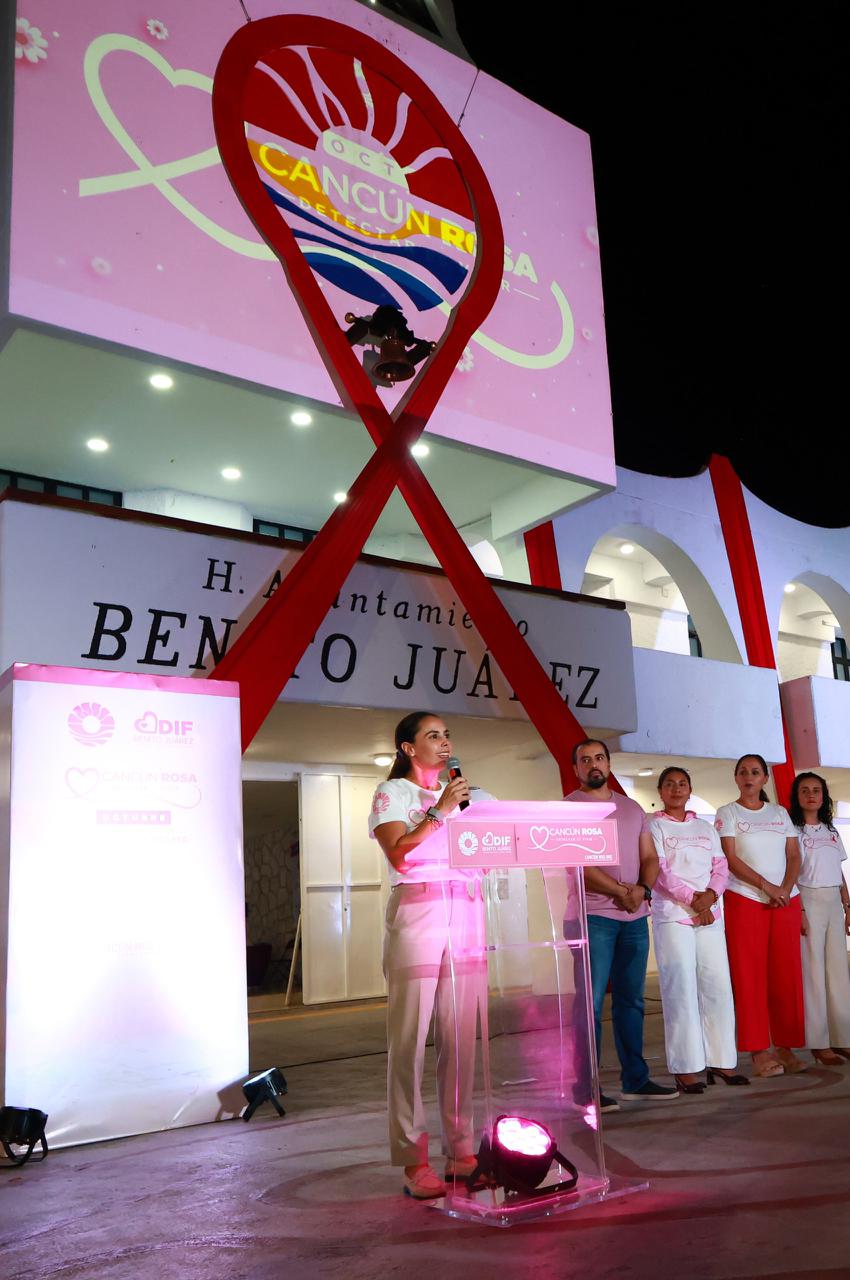 Cancún, Q. R., a 07 de octubre de 2025.- En el marco de la campaña municipal “Cancún Rosa. Detectar es Vivir”, impulsada por el Sistema para el Desarrollo Integral de la Familia (DIF) Benito Juárez, para prevenir y crear conciencia sobre el cáncer de mama, la Presidenta Municipal, Ana Paty Peralta, encabezó el evento Cancún se Pinta de Rosa, por las Mujeres, con diversas actividades y el icónico encendido rosa de la fachada del Palacio Municipal.