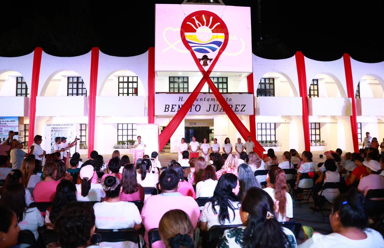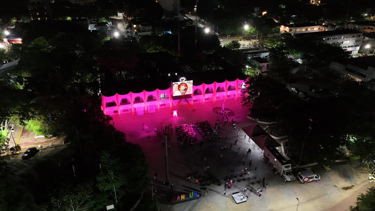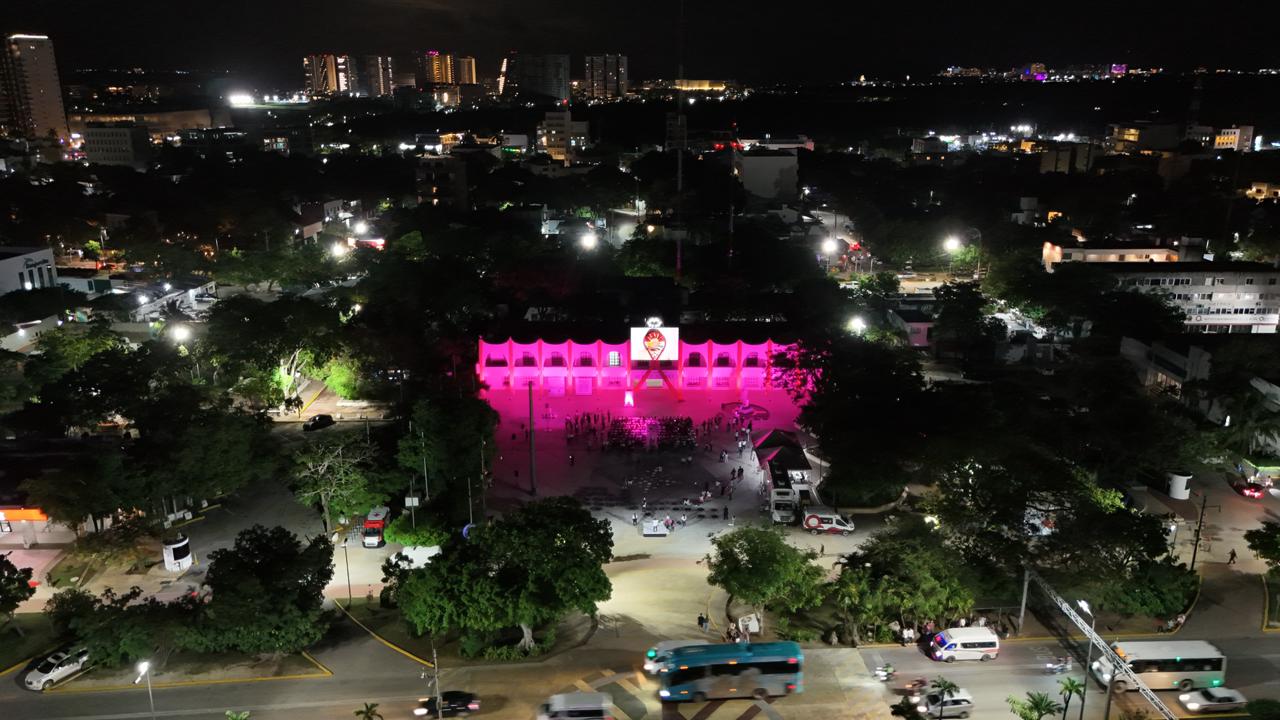 Sin embargo, uno de los momentos más significativos fue el encendido del Palacio Municipal en un vibrante color rosa, iluminando la noche como un símbolo de esperanza, lucha y conciencia sobre la salud de las cancunenses.
