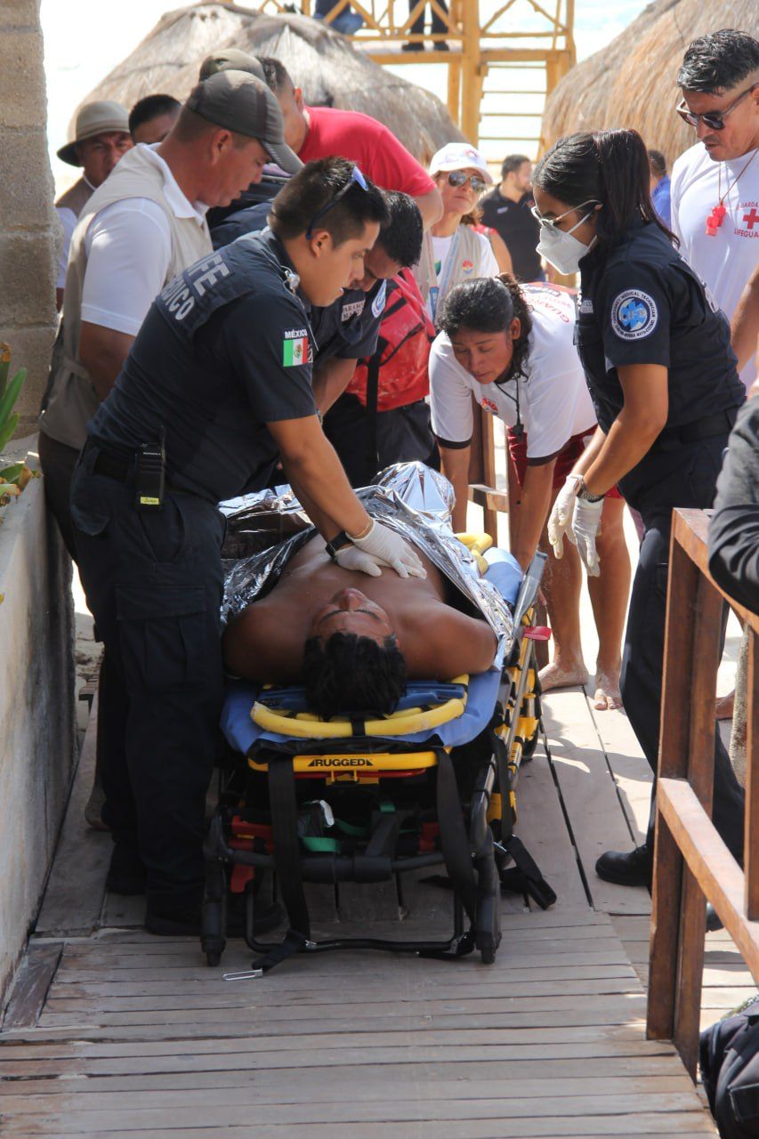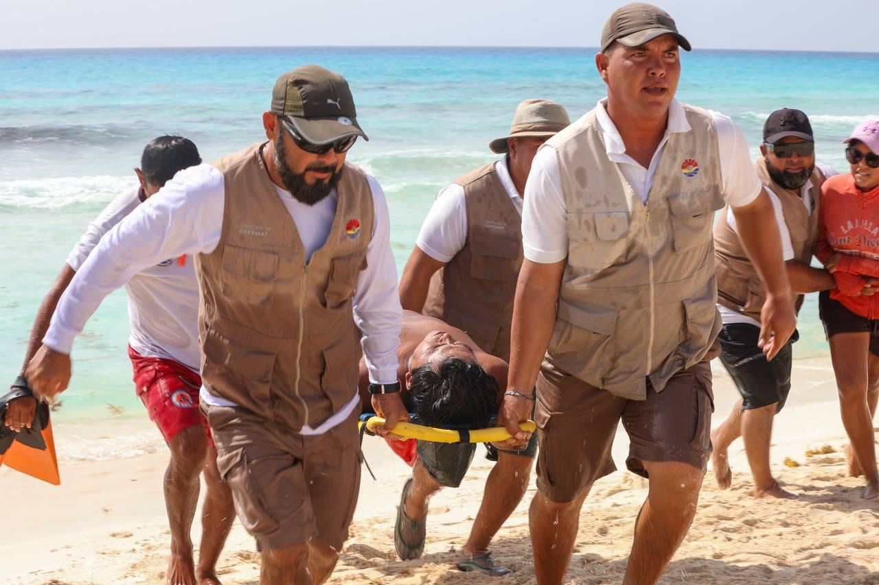 De acuerdo con el procedimiento de atención en caso de este tipo de emergencias, bajaron a la playa también los paramédicos de la ambulancia y reforzaron la atención inmediata, trasladándolo en camilla hacia la unidad de auxilio en la que siguieron con la valoración que determinó su traslado hacia el hospital más cercano, acción que dio conclusión al ejercicio.