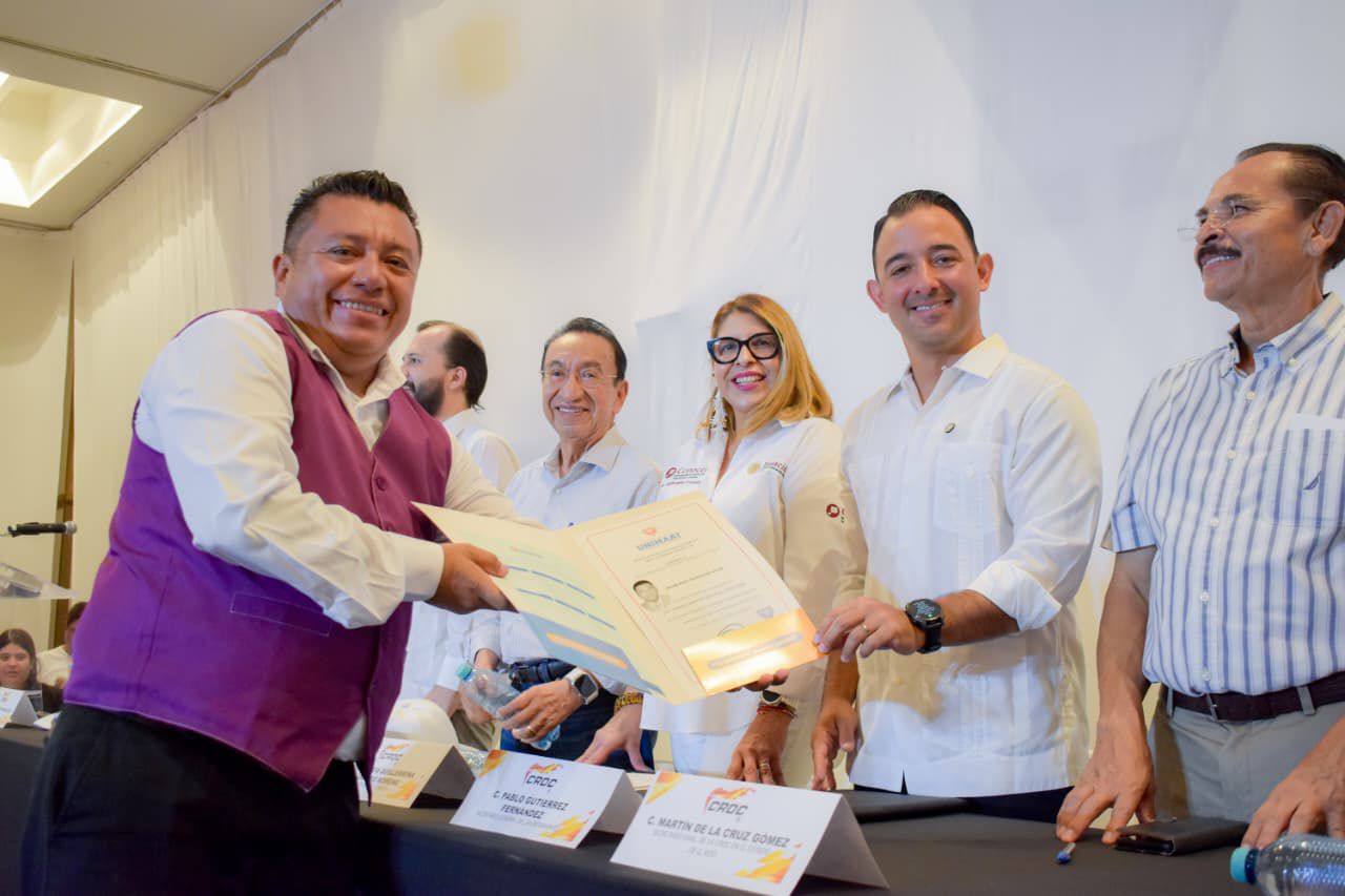 Cancún, Q. R., a 28 de octubre de 2025. — En representación de la Presidenta Municipal, Ana Paty Peralta, el secretario general del Ayuntamiento de Benito Juárez, Pablo Gutiérrez Fernández, participó en la entrega de 615 Certificados de Competencia Laboral y 36 Certificados de Máster Sindical, otorgados a trabajadoras y trabajadores afiliados a la CROC, en un acto que destacó la importancia de la capacitación y el compromiso con la calidad del servicio en Cancún.