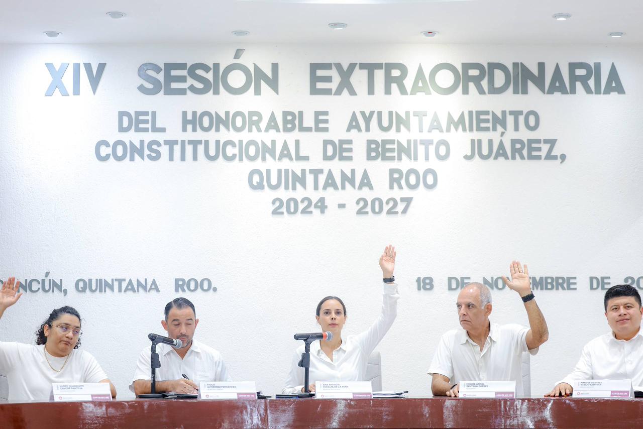 Cancún, Q. R., a 18 de noviembre de 2025.- En el marco de la Décima Cuarta Sesión Extraordinaria de Cabildo, la Presidenta Municipal, Ana Paty Peralta, junto al cuerpo colegiado, aprobó por mayoría de votos las iniciativas de Reforma a la Ley de Hacienda y la Ley de Ingresos del Municipio de Benito Juárez para el ejercicio fiscal 2026, que contempla esta última un incremento del 8.08% en comparación al 2025, sin crear nuevos impuestos y considerando la economía de las familias cancunenses.