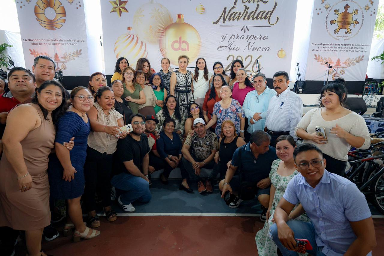 Cancún, Q. R., a 19 de diciembre de 2025.- “No hay gobierno de resultados sin su gente, sin el esfuerzo de cada uno de ustedes; no hay trabajo menor ni puesto menor, todos y cada uno de ustedes son importantes para mí, por eso vengo a agradecerles todo su esfuerzo, sacrificio, entrega y compromiso en este año y los años que me ha tocado estar al frente del municipio”, manifestó la Presidenta Municipal, Ana Paty Peralta, a los colaboradores agremiados al Sindicato de Trabajadores al Servicio del Ayuntamiento de Benito Juárez y de sus Organismos Descentralizados (SUTSABJYOD), durante su Posada Navideña 2025.
