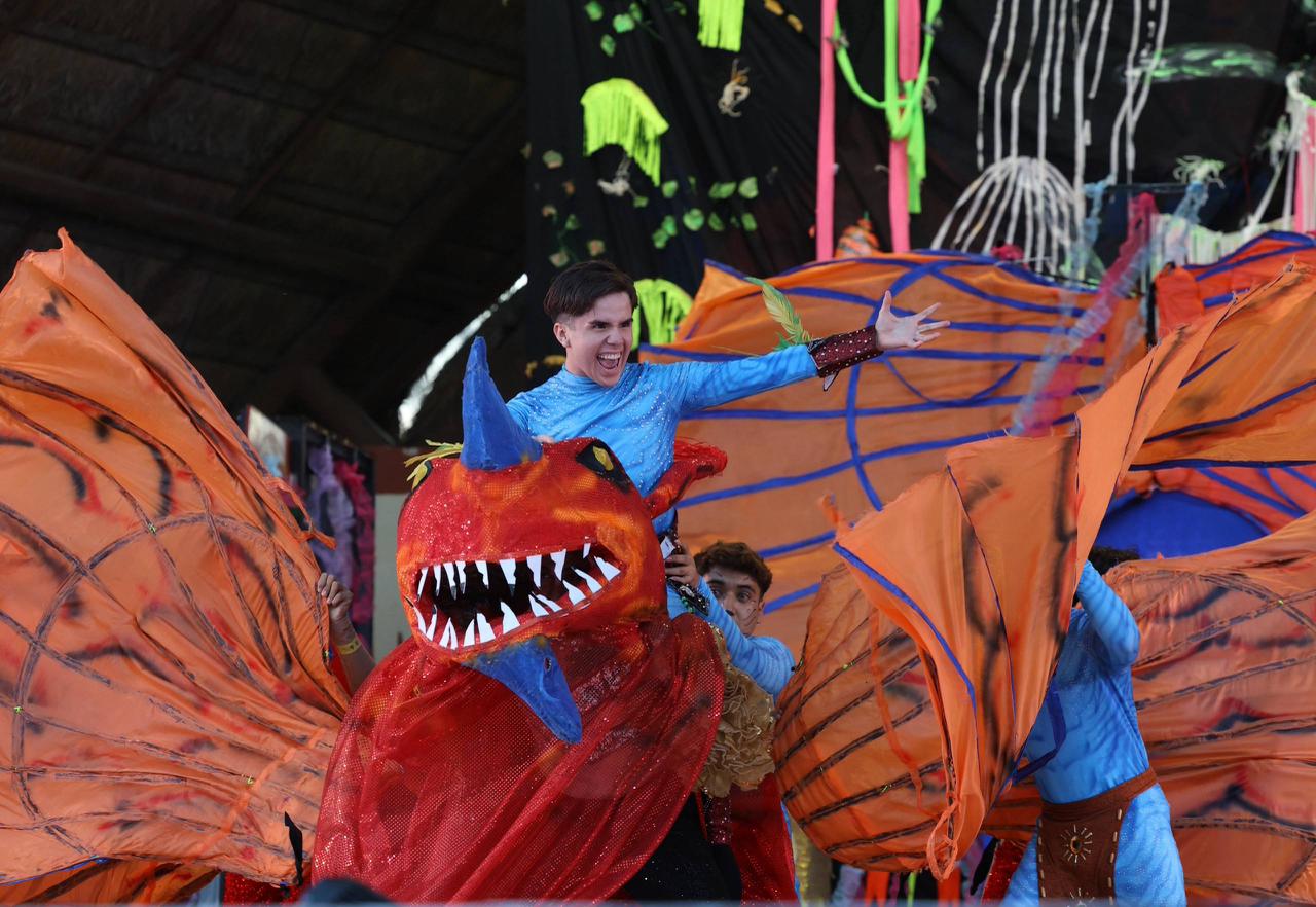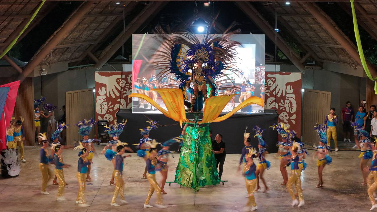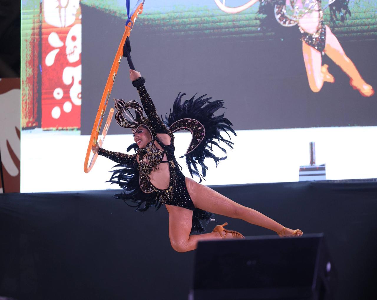 gala, traje de baño, bailes individuales y con sus comparsas donde las plumas,