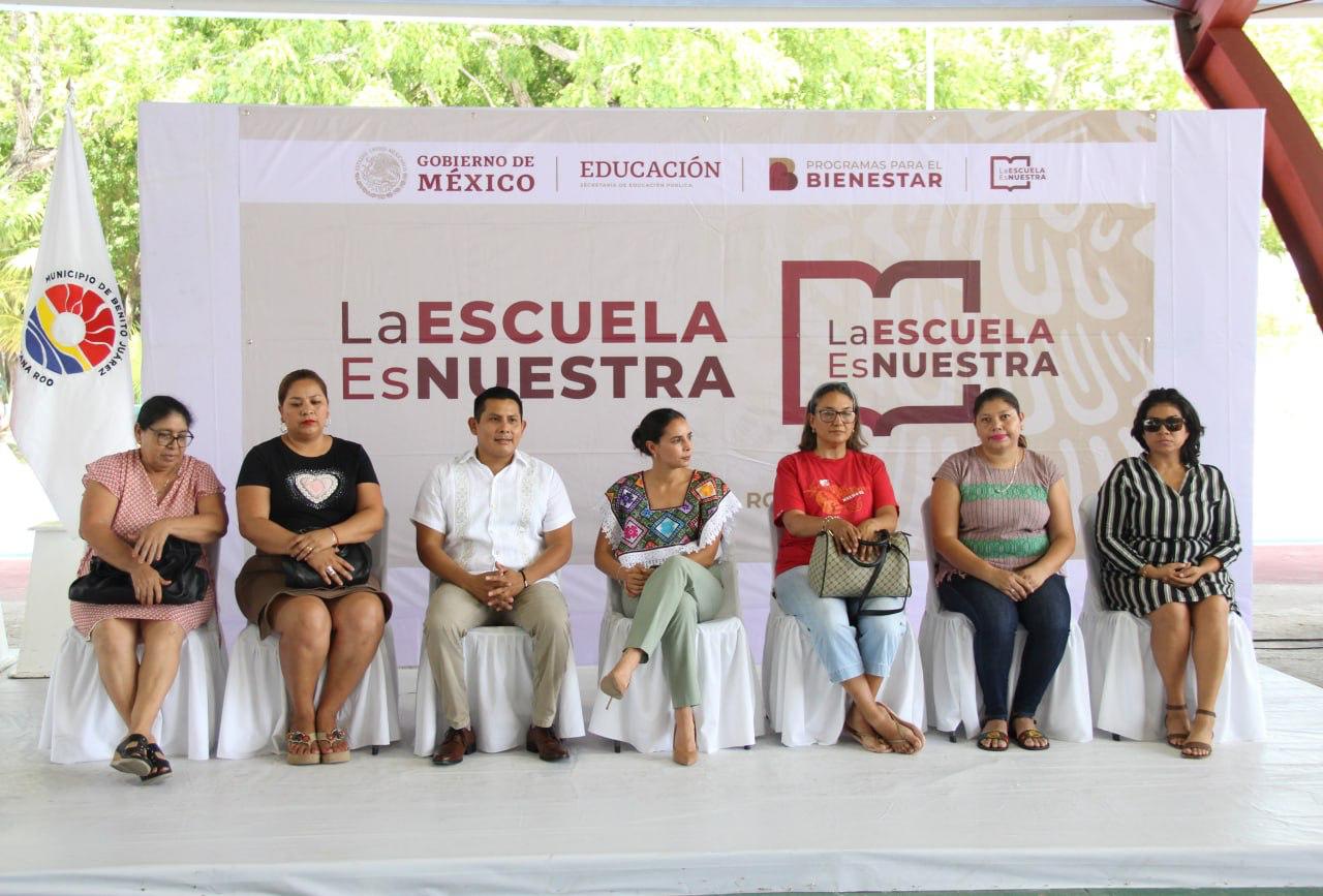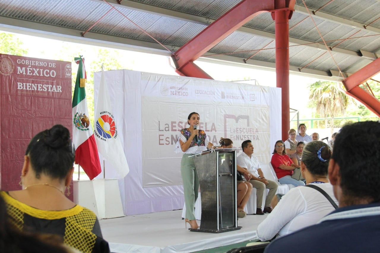 Cancún, Q. R., a 02 de agosto de 2023.- La Presidenta Municipal de Benito Juárez, Ana Paty Peralta, participó en la entrega de Tarjetas del Programa “La Escuela es Nuestra”, a 16 escuelas de nivel básico en Benito Juárez, Puerto Morelos y Leona Vicario, las cuales podrán acceder a un presupuesto para invertir en mejoras en instalaciones eléctricas, hidráulicas o sanitarias; mantenimiento preventivo, e incluso construcción de aulas y domos.