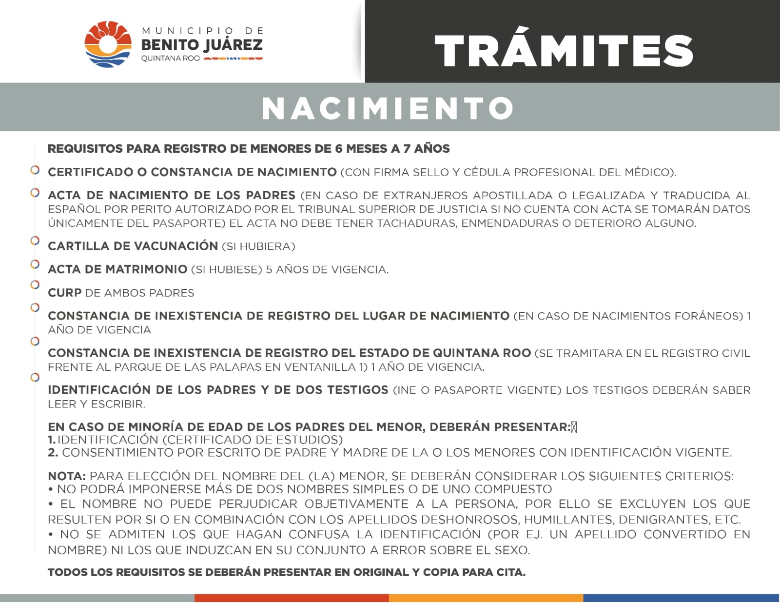 Para poder realizar este trámite, los padres de familia deberán presentar original y copia de la siguiente documentación: certificado o constancia de nacimiento, acta de nacimiento de los padres, cartilla de vacunación -si hubiera-, acta de matrimonio -en caso de estar casados-, CURP de ambos padres, constancia de inexistencia de registro del Estado de Quintana Roo, identificación de los padres y de dos testigos. En caso de minoría de edad de los padres del menor se deberá presentar, certificados de estudios y consentimiento por escrito e identificación vigente del padre o madre de los menores.