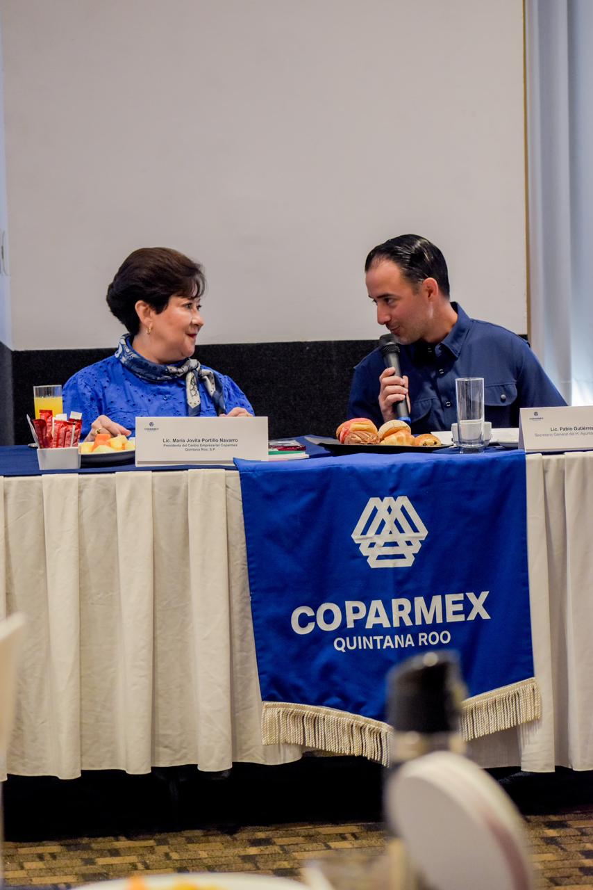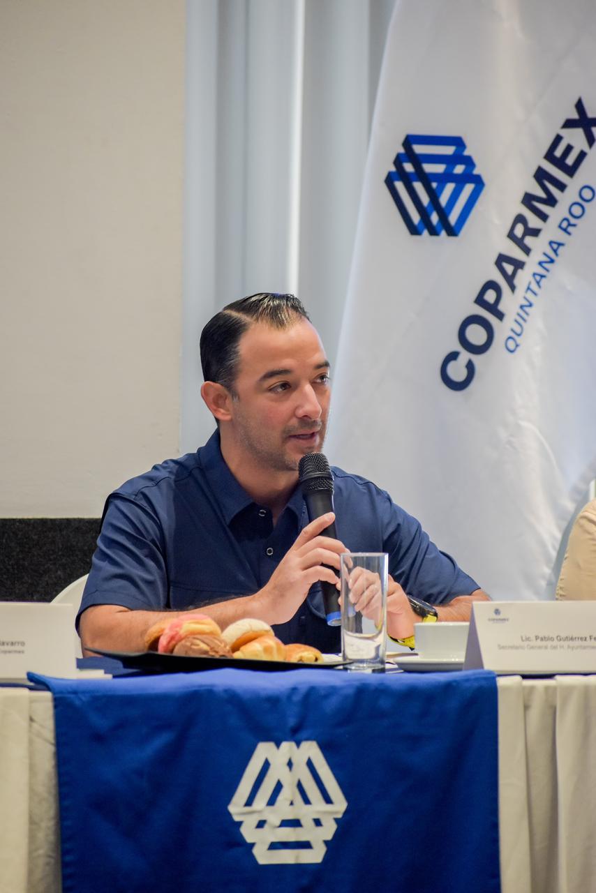 Cancún, Q. R., a 28 de enero de 2026.- Con el objetivo de consolidar un canal institucional, formal y permanente de diálogo entre el sector empresarial y el gobierno municipal, el secretario general del Ayuntamiento de Benito Juárez, Pablo Gutiérrez Fernández, encabezó la Sesión Ordinaria del Consejo Directivo de COPARMEX Quintana Roo y la instalación de Mesas de Trabajo, en representación de la Presidenta Municipal, Ana Paty Peralta.