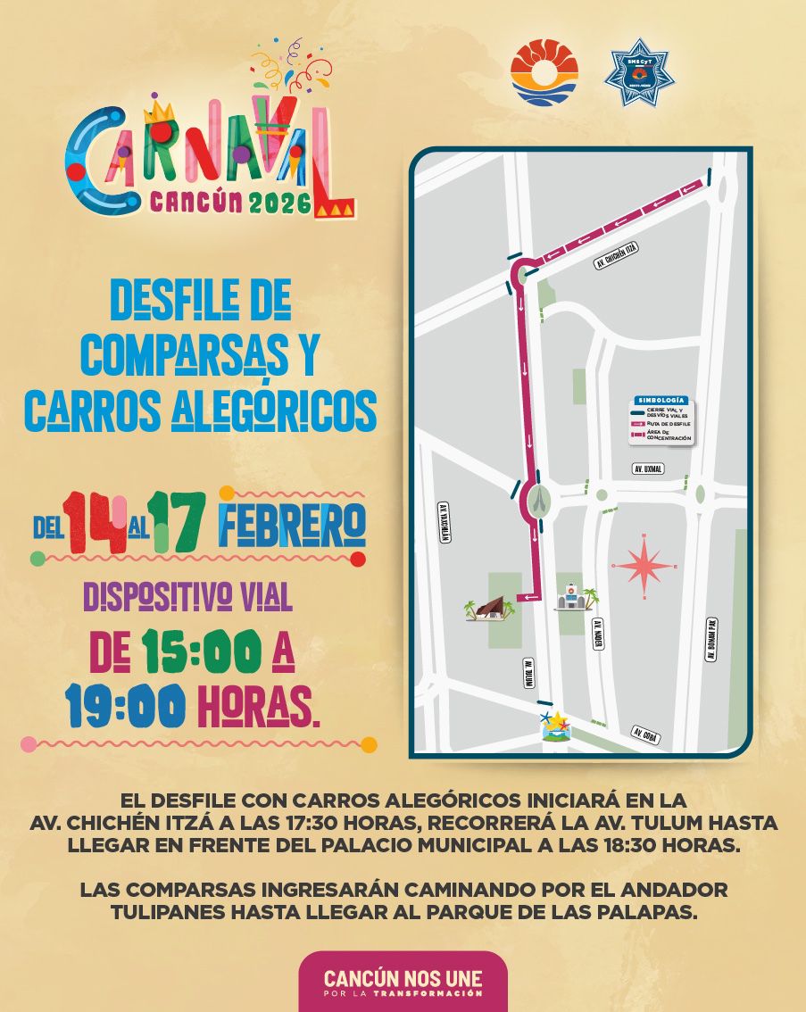 El desfile de comparsas y carros alegóricos se realizará del 14 al 17 de febrero, implementándose el dispositivo vial de 15:00 a 19:00 horas en la Av. Tulum con Av. Uxmal y Av. Cobá, ya que el recorrido iniciará en la Av. Chichén Itzá a las 17:30 horas, para recorrer la Av. Tulum hasta llegar frente al Palacio Municipal a las 18:30 horas y posteriormente, las comparsas ingresarán caminando por el andador Tulipanes hasta llegar al Parque de Las Palapas.