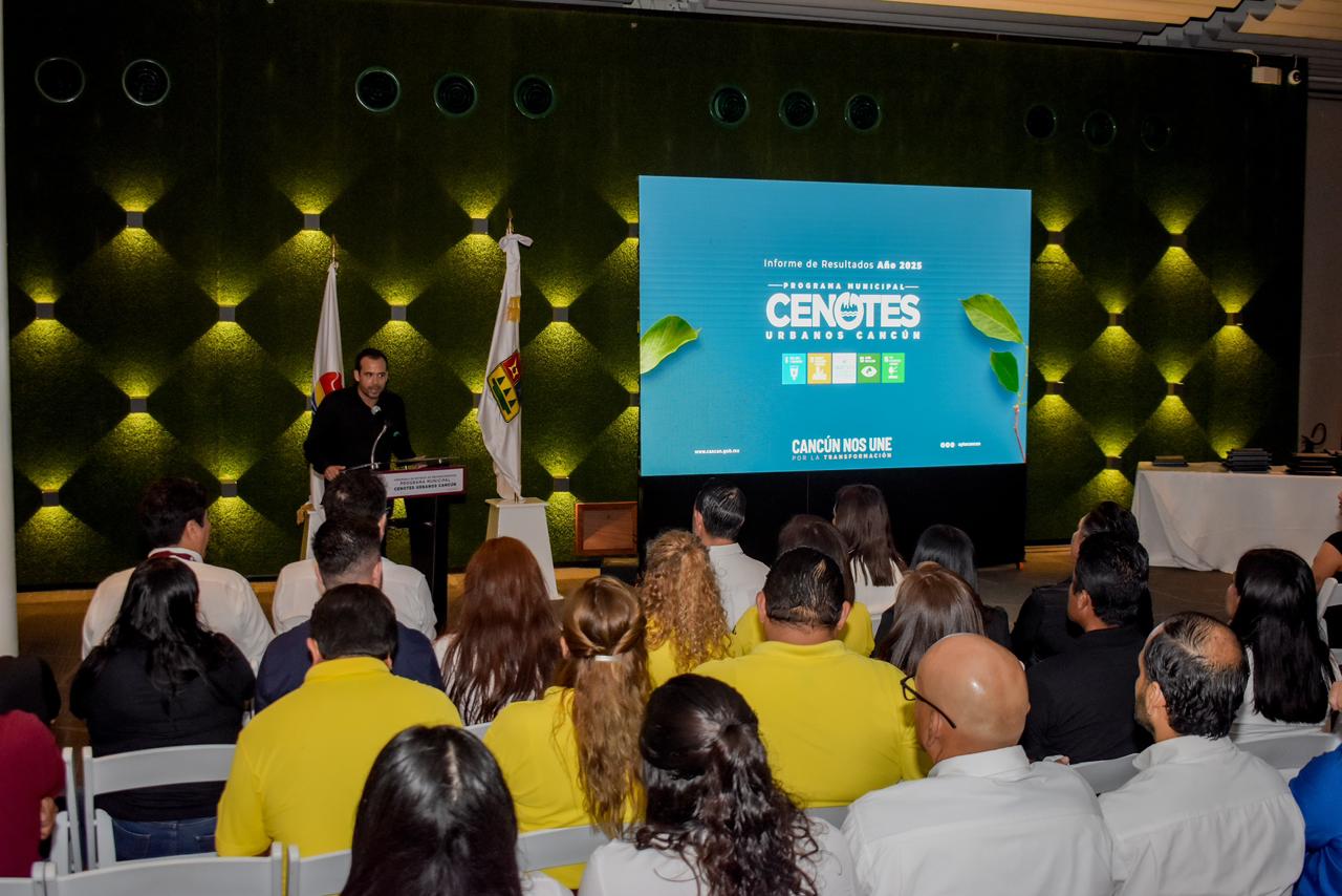Por su parte, el director general de Ecología del Ayuntamiento de Benito Juárez, Fernando Haro Salinas, presentó el informe de resultados del programa Cenotes Urbanos Cancún, destacando que durante 2025 se intervinieron 19 cenotes urbanos mediante 23 jornadas de saneamiento, logrando la recuperación de 17.9 toneladas de residuos sólidos.