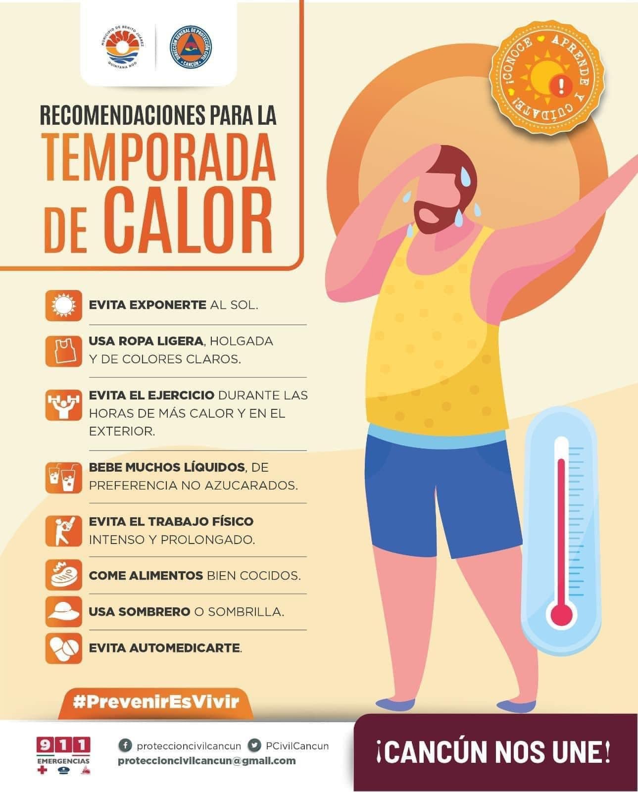 En caso de sufrir un golpe de calor, se recomienda a las y los cancunenses aplicar paños húmedos en las axilas e ingles, colocarse en un ambiente fresco con aire acondicionado e hidratarse para evitar desmayos e insolación.