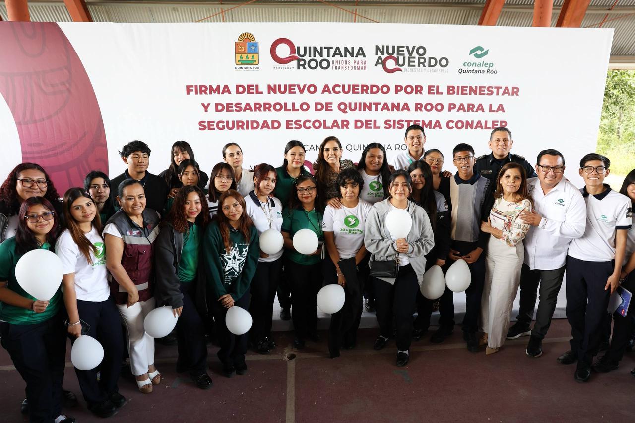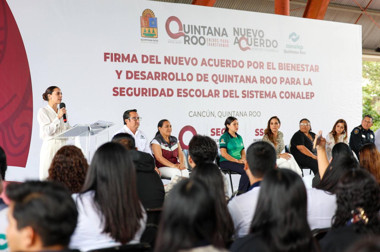 Cancún, Q. R., a 24 de febrero de 2026.- La Presidenta Municipal, Ana Paty Peralta, firmó como testigo de honor el Nuevo Acuerdo por el Bienestar y Desarrollo de Quintana Roo para la Seguridad Escolar del Sistema Colegio Nacional de Educación Profesional y Técnica (CONALEP) encabezada por la gobernadora, Mara Lezama, con el objetivo de fortalecer los protocolos de actuación ante emergencias y situaciones de violencia en entornos escolares, por medio de videovigilancia del Complejo de Seguridad Quintana Roo C5.