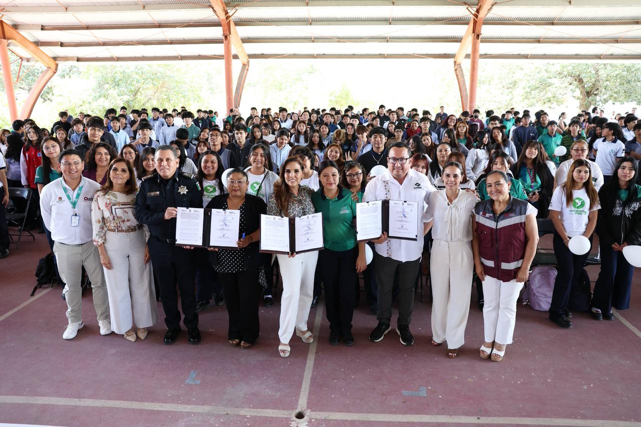 Posteriormente, se procedió a la firma de convenio: la gobernadora, Mara Lezama; el secretario de Seguridad Ciudadana, Julio César Gómez Torres; el director del CONALEP Plantel II, Aníbal José Montalvo Pérez y como testigo de honor, la Presidenta Municipal, Ana Paty Peralta.