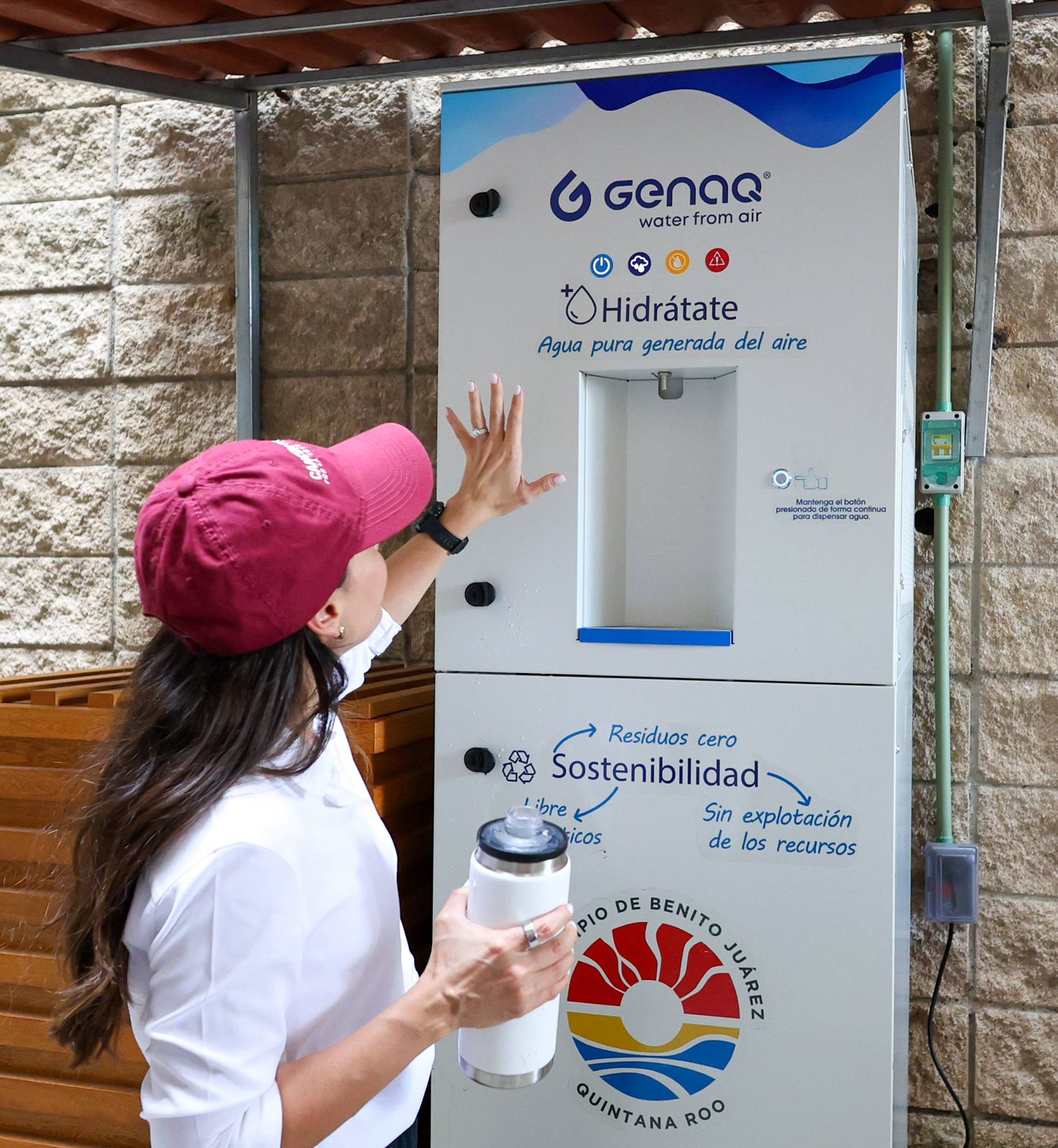 Cancún, Q. R., a 05 de marzo de 2026.- Como parte del compromiso del Ayuntamiento de Benito Juárez con la sustentabilidad y el bienestar social, la Presidenta Municipal, Ana Paty Peralta, constató la implementación de tecnología innovadora que permitirá dotar de agua potable accesible y gratuita a la ciudadanía, así como a las y los empleados municipales, mediante equipos con una tecnología sustentable.